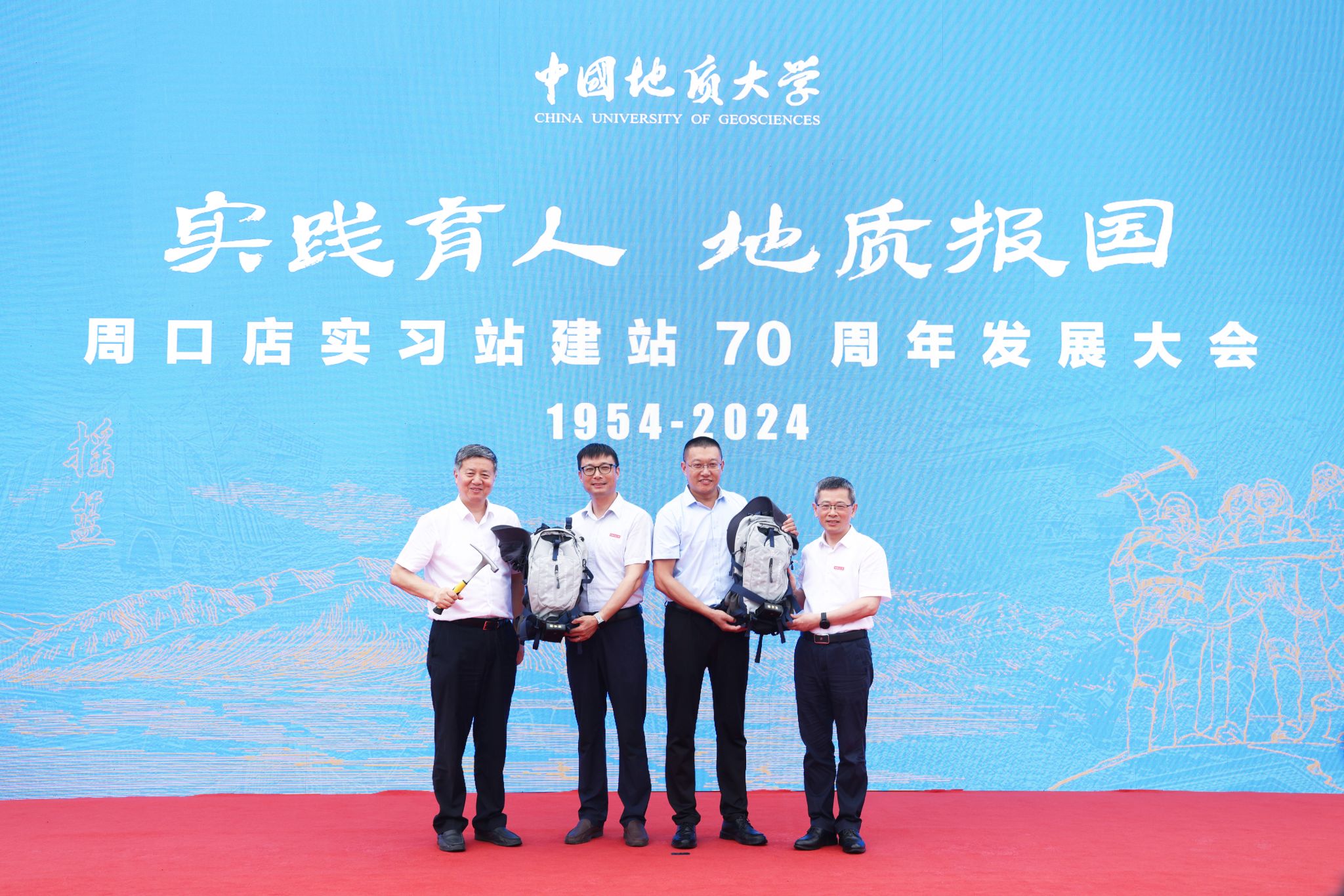 中國地質大學(武漢)校長李建威、中國地質大學(北京)校長孫友宏向周口店實習隊隊長贈予紀念品。