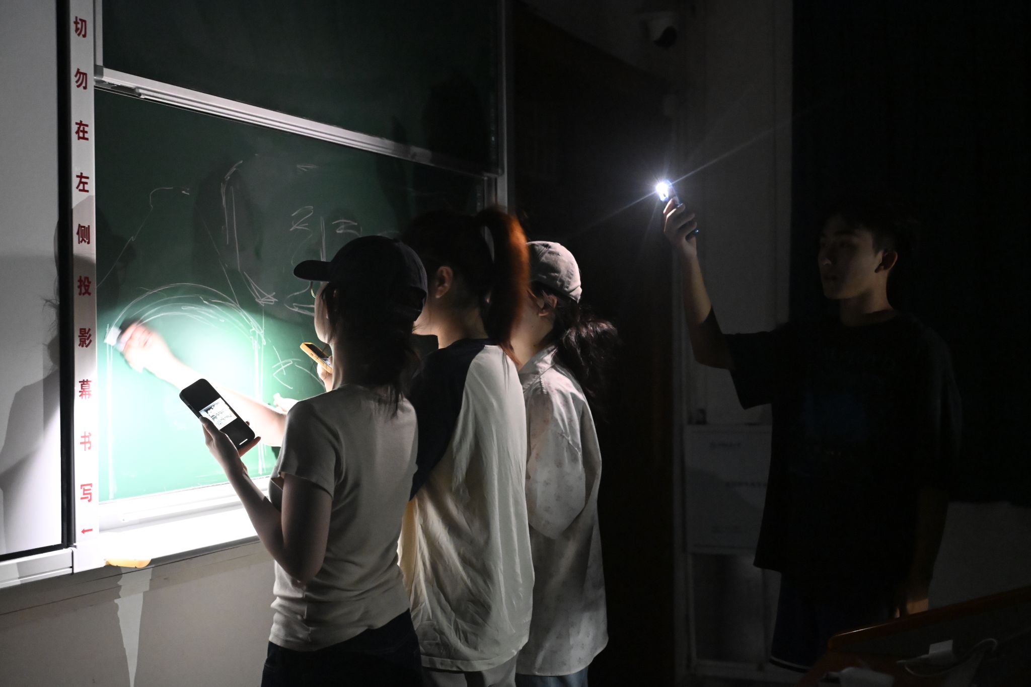 學生在手機燈光下繪制板畫 攝影 李恒一