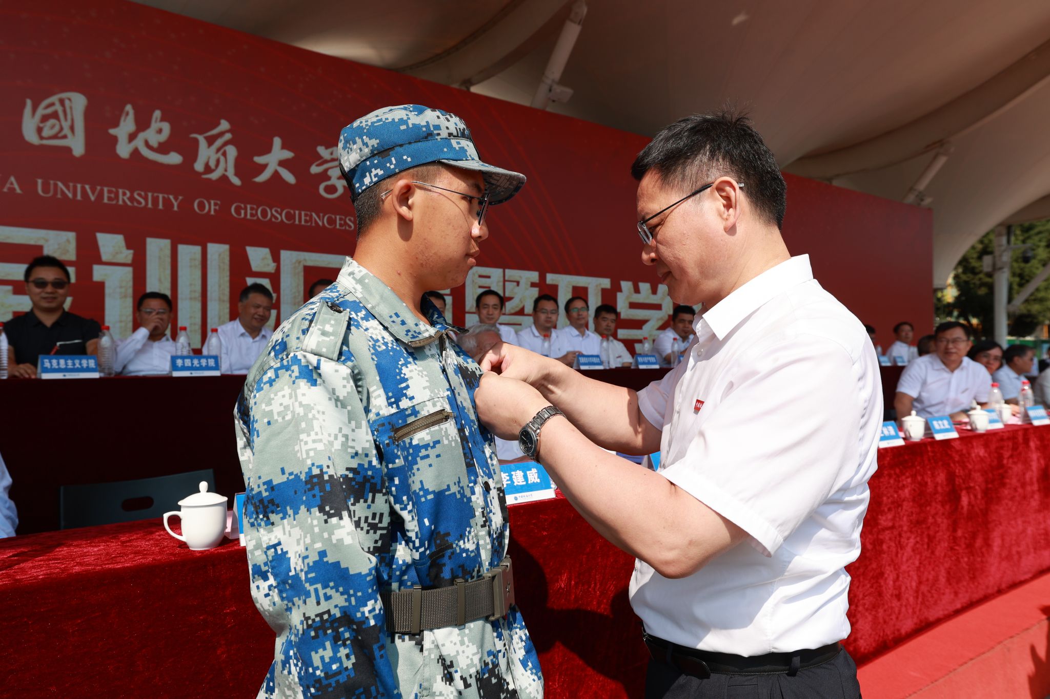 校黨委書記劉杰為本科新生代表佩戴校標。全體本科新生佩戴中國地質大學校標,成為光榮的地大人。