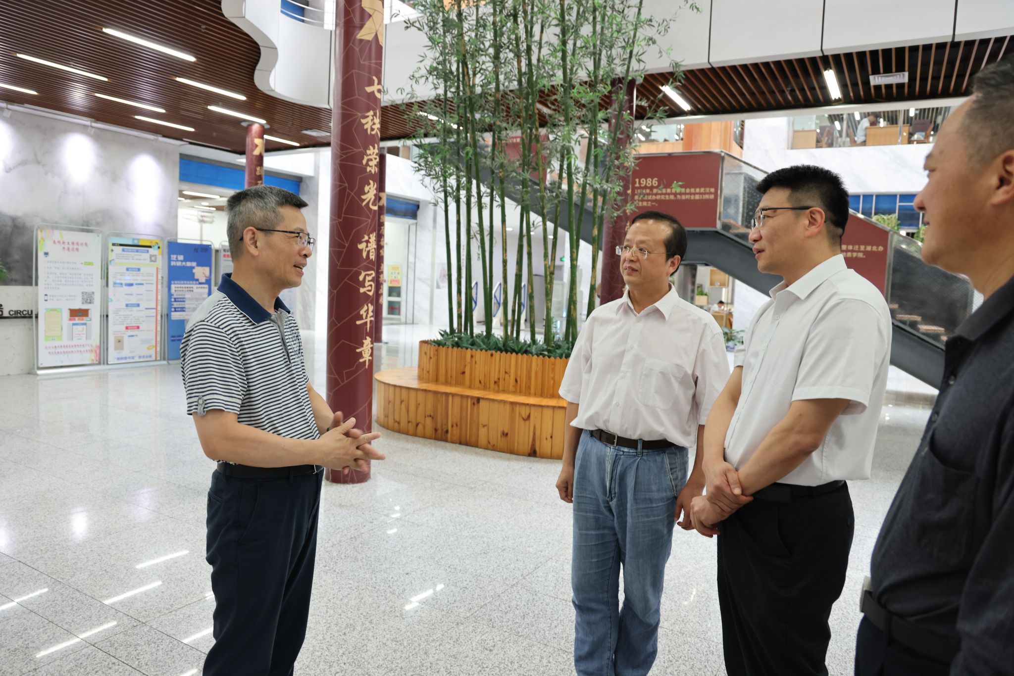 在南望山校區圖書館,李建威向楊帆一行表示歡迎,感謝國家知識產權局、湖北省知識產權局、審協湖北中心長期以來對我校的關心和支持,并介紹了我校基本情況、特色優勢、知識產權儲備及其公共服務建設的最新進展。圖書檔案與文博部部長帥斌匯報了我校高校國家知識產權信息服務中心的人員配備、軟硬件配置、服務事項設置、辦件流程管理、宣傳推介、發展方向定位及其機制優化的思考等方面情況。