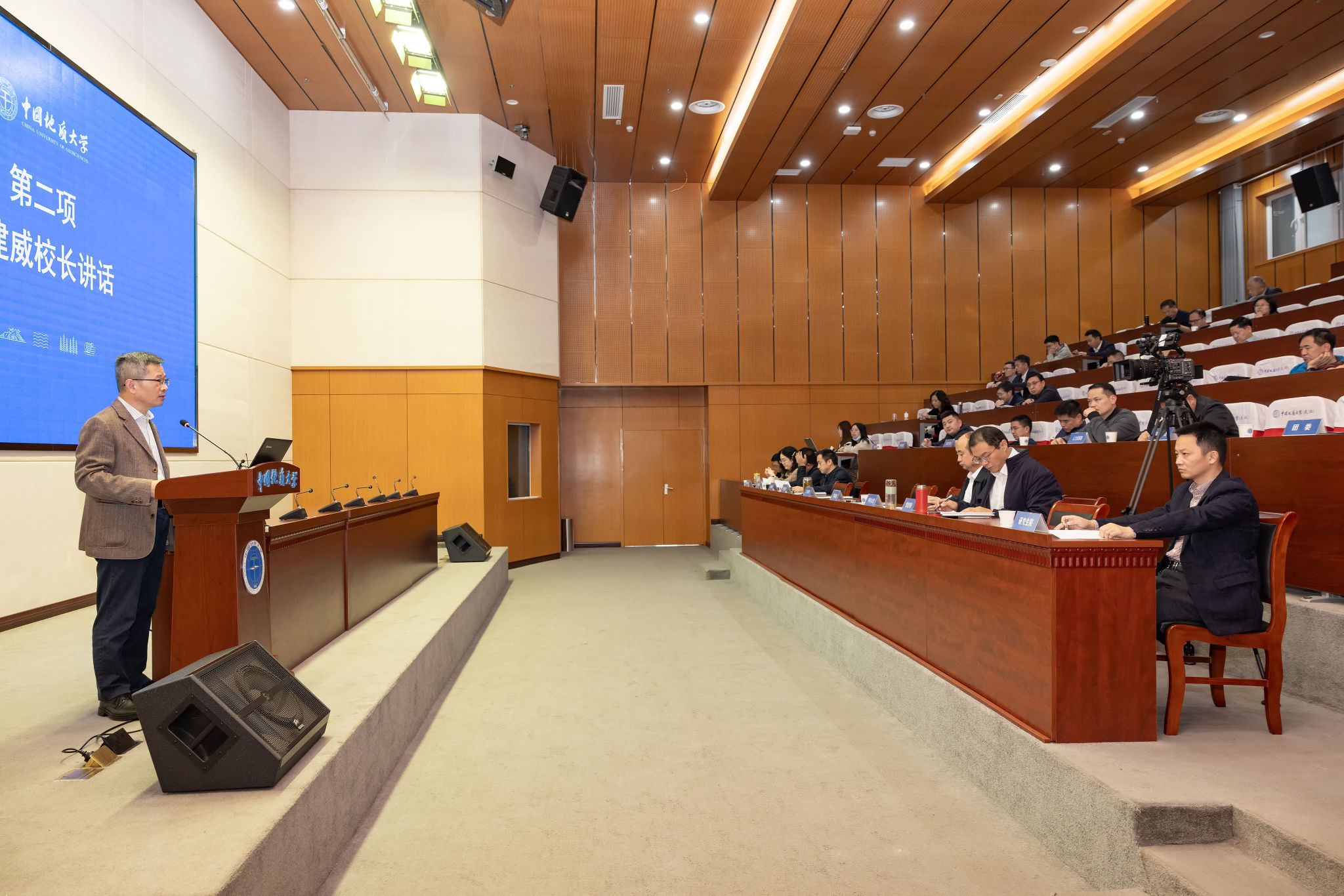 李建威講話。他指出,地質e站是學校貫徹落實黨的二十屆三中全會和全國教育大會精神,在建設中國式現(xiàn)代化的時代大背景中,落實立德樹人根本任務,賡續(xù)學校實踐育人的優(yōu)良傳統(tǒng),高質量服務地質行業(yè)和自然資源行業(yè)的重大戰(zhàn)略舉措,是探索科產教融合高水平育人、培養(yǎng)地質領域拔尖創(chuàng)新人才的創(chuàng)新舉措,也是學校對接國家重大戰(zhàn)略,服務新一輪找礦突破戰(zhàn)略行動的重要抓手。各單位要準確把握建設地質e站的背景意義和內涵實質,貫徹落實學校“五通融合”立德樹人體系,深化人才培養(yǎng)理念和模式改革,統(tǒng)籌匯聚各方育人資源,重構育人鏈條,重塑評價體系,以地質e站為依托扎實推進拔尖創(chuàng)新人才培養(yǎng)。