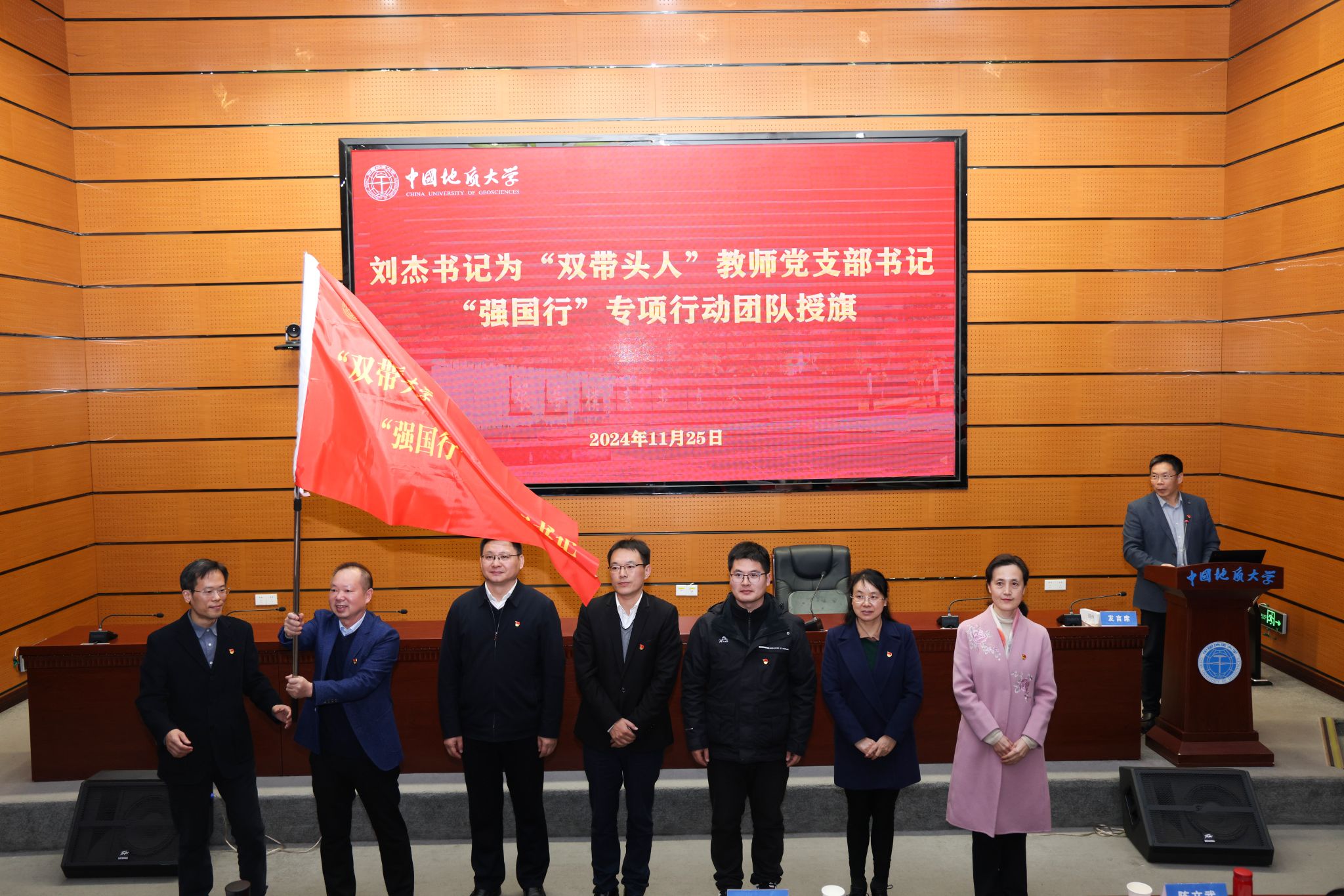 培訓期間,劉杰為入選全國和湖北省“雙帶頭人”教師黨支部書記“強國行”專項行動團隊的6個支部授旗。