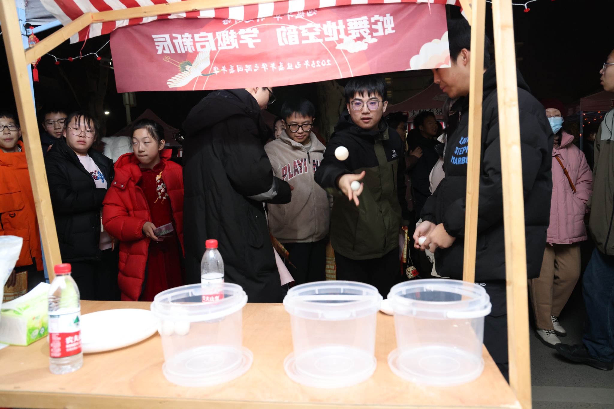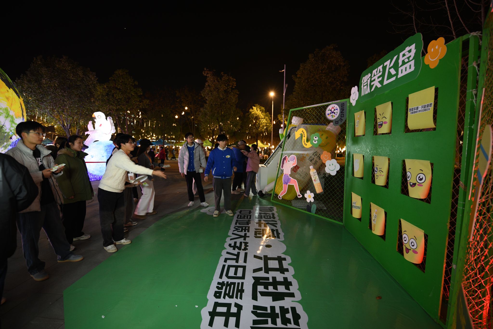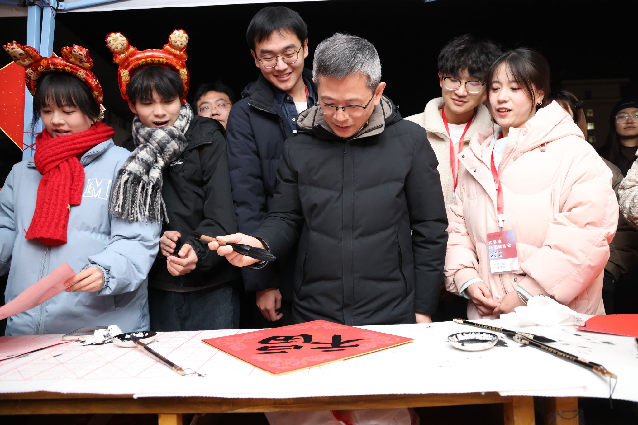 在南望山校區弘毅路上,來自16個學院的50個攤位盛情開啟,精彩連連,“福韻年俗街”“瑞物盈門集”“笑語文娛廊”“樂趣體驗坊”“智趣學海園”五大板塊各具特色,給師生帶來豐富的新年活動體驗。福韻年俗街上,靈韻笛簫社樂聲悠揚,傳遞著濃濃的年味;在面部彩繪攤位前,人潮涌動,畫師正精心為游客繪制圖案,分享著新年的祝福。藝媒學院“接歌大王”活動、公共管理學院“吹墨畫”活動和資源學院“制作漆扇”活動別具特色。海洋學院“沙畫繪制”、地球科學學院“地質接接樂”吸引了師生們駐足參與,機電學院“機械臂與機器狗”展示逗趣可愛。