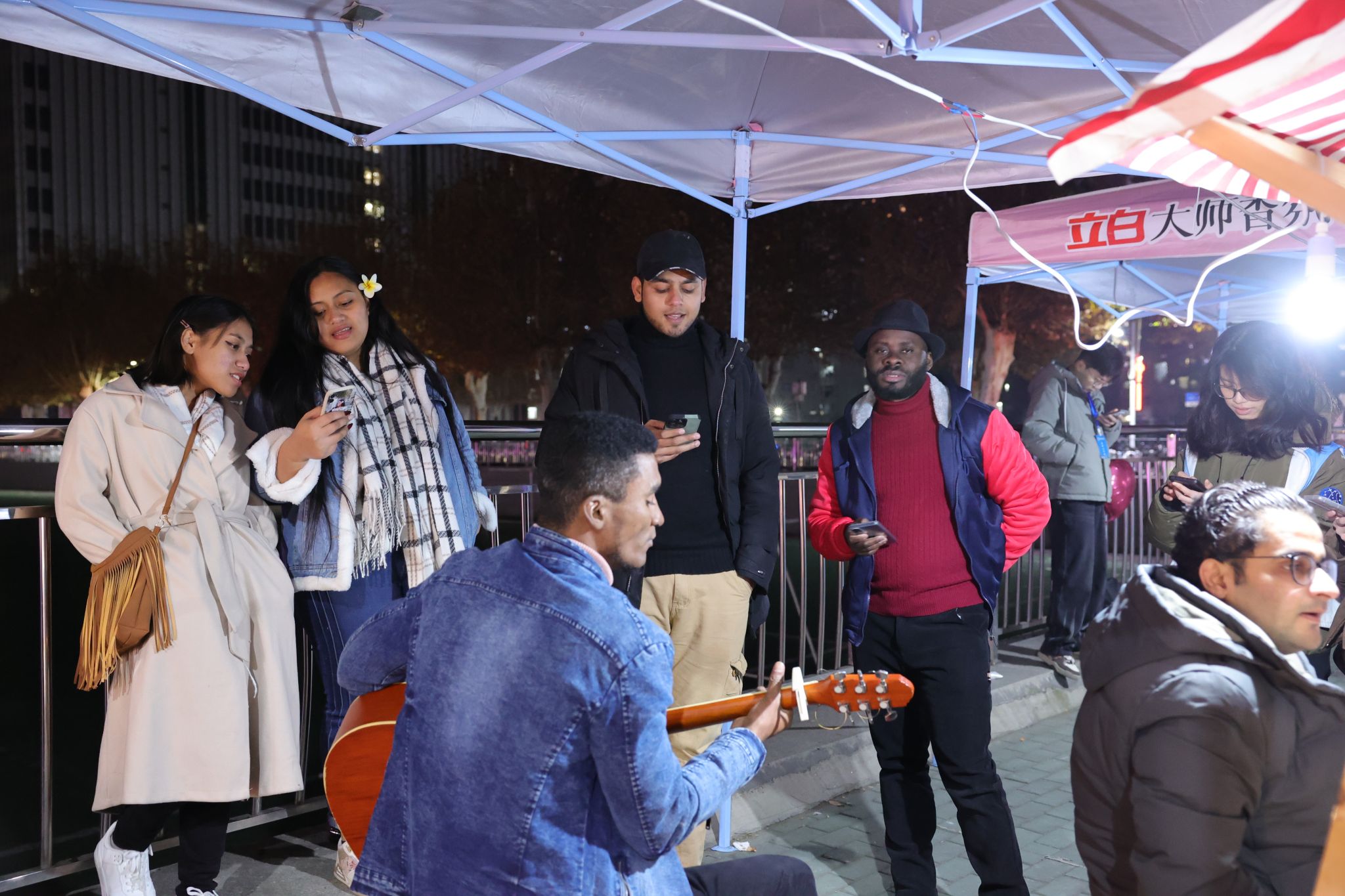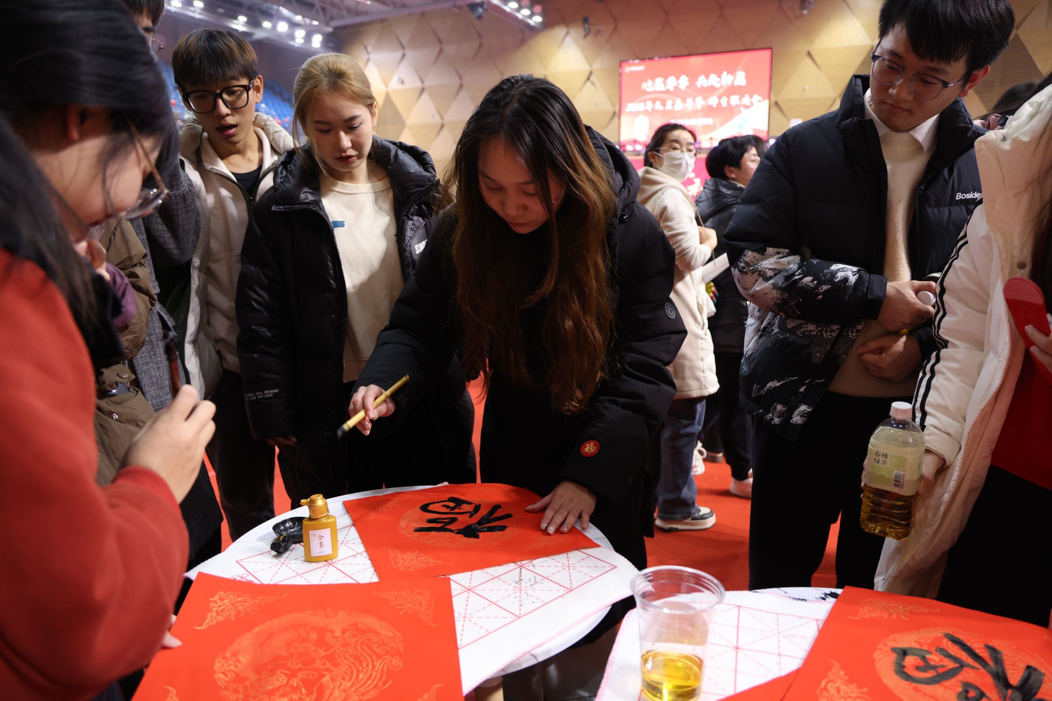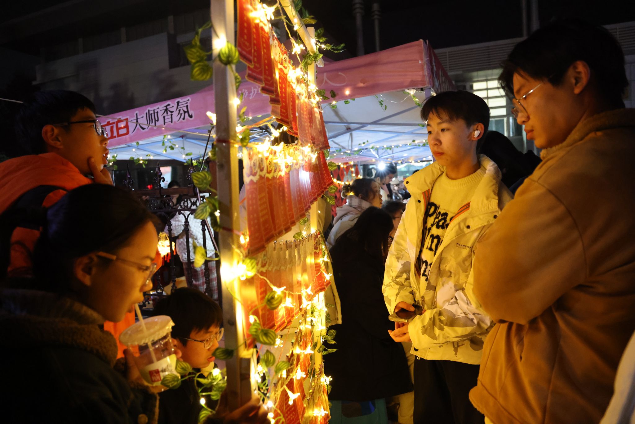 在南望山校區弘毅路上,來自16個學院的50個攤位盛情開啟,精彩連連,“福韻年俗街”“瑞物盈門集”“笑語文娛廊”“樂趣體驗坊”“智趣學海園”五大板塊各具特色,給師生帶來豐富的新年活動體驗。福韻年俗街上,靈韻笛簫社樂聲悠揚,傳遞著濃濃的年味;在面部彩繪攤位前,人潮涌動,畫師正精心為游客繪制圖案,分享著新年的祝福。藝媒學院“接歌大王”活動、公共管理學院“吹墨畫”活動和資源學院“制作漆扇”活動別具特色。海洋學院“沙畫繪制”、地球科學學院“地質接接樂”吸引了師生們駐足參與,機電學院“機械臂與機器狗”展示逗趣可愛。