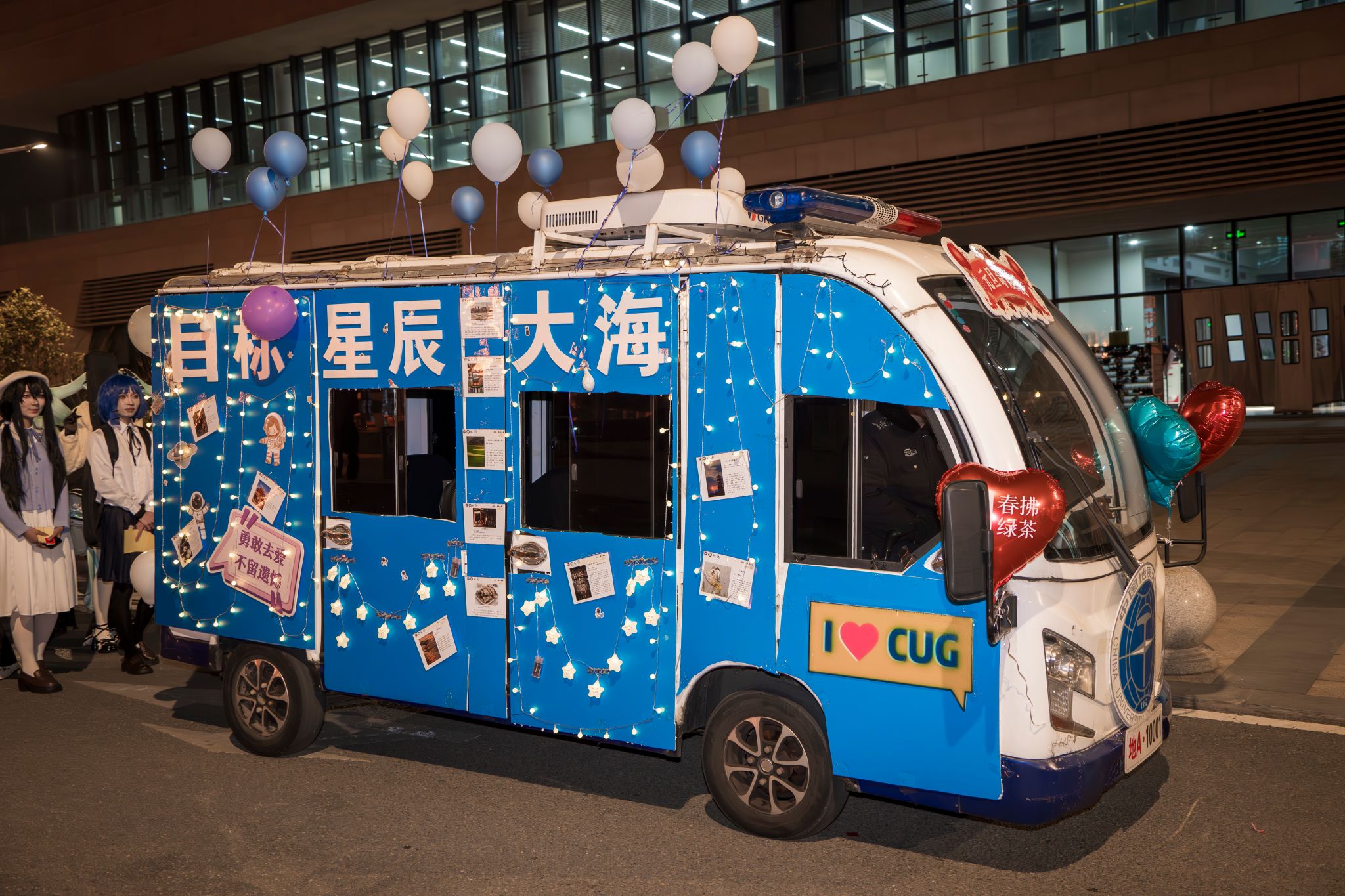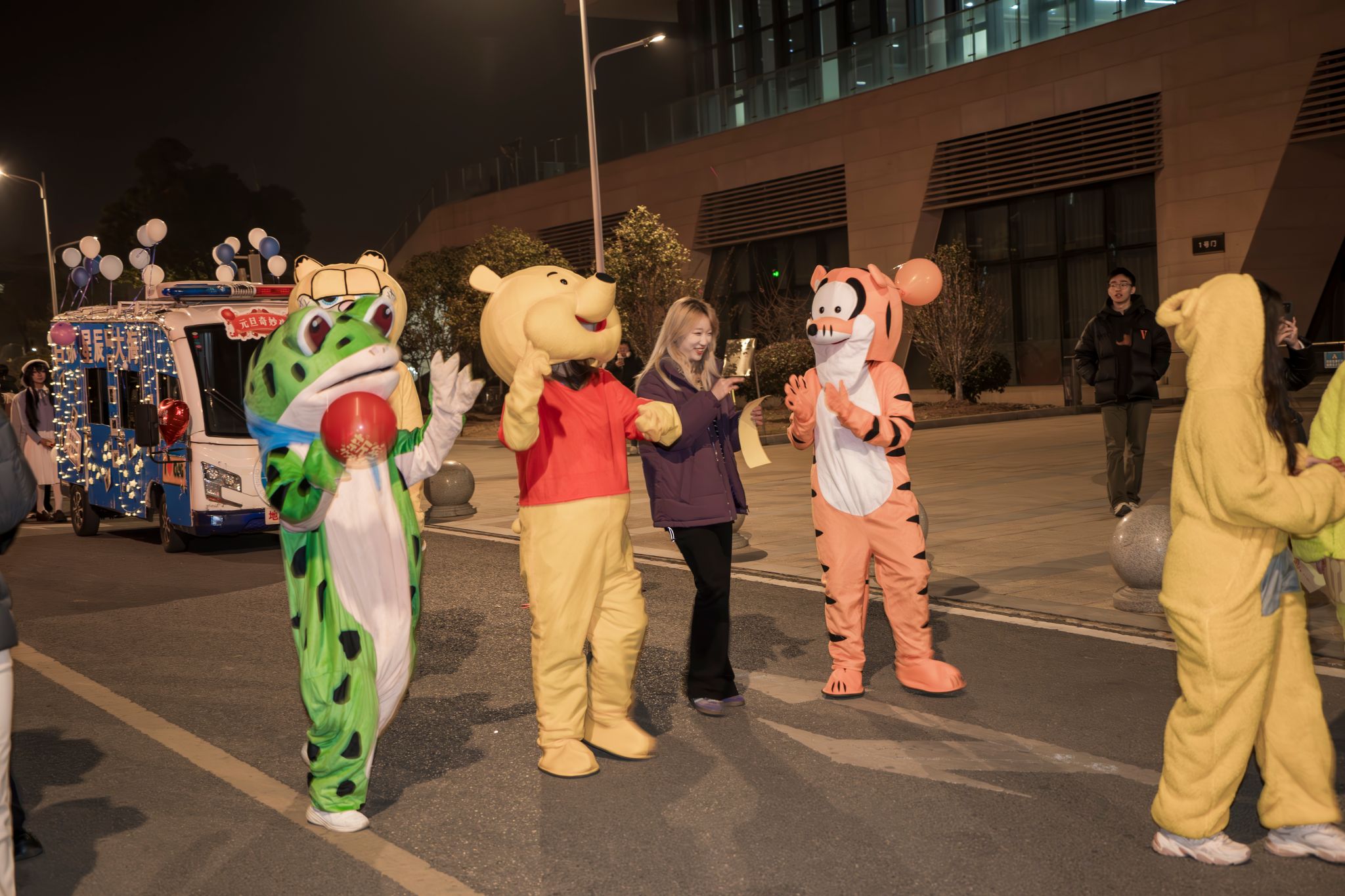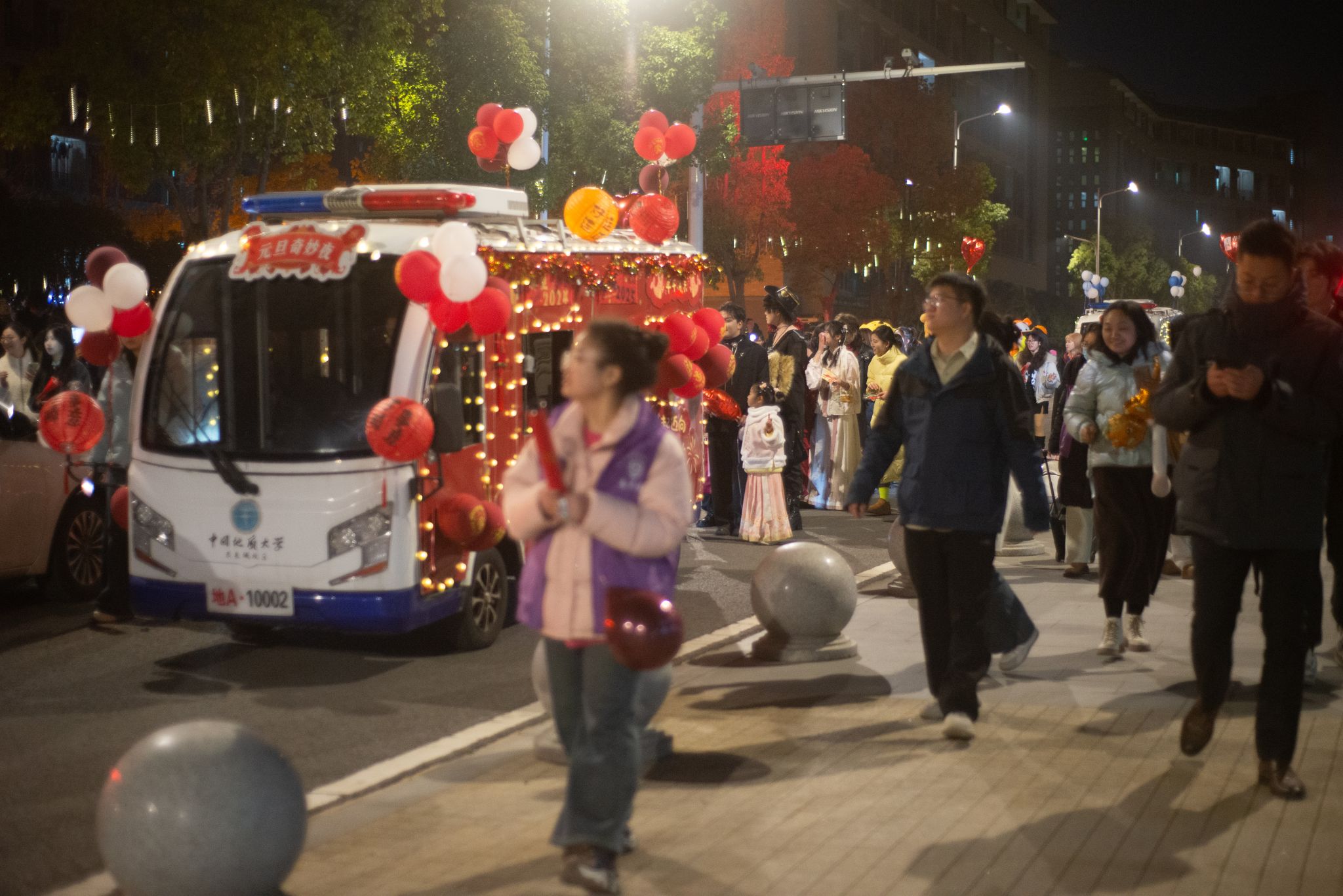 在未來城校區圖書館門口,伴隨著歡快的音樂,一輛輛花車緩緩駛來,“元旦奇妙夜”活動正式拉開序幕。花車上的彩燈閃爍,40名身著玩偶服、漢服等服裝的同學們,手持貼紙和彩色氣球,向圍觀的師生們揮手致意。阿布都薩拉木同學演唱的歌曲《When we were young》旋律悠揚柔和,經濟管理學院舞蹈團舞姿優雅大方,充滿力量與美感。