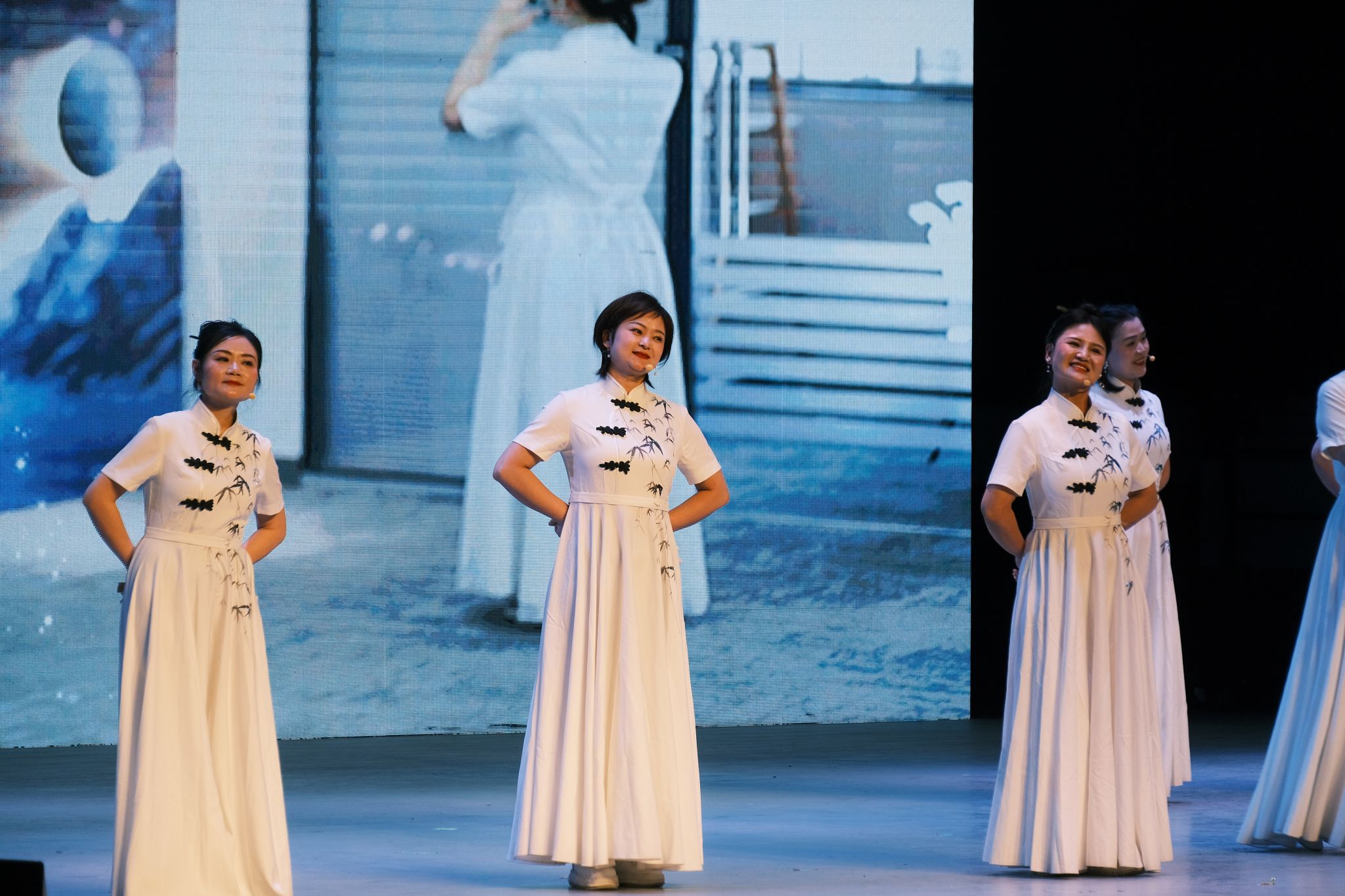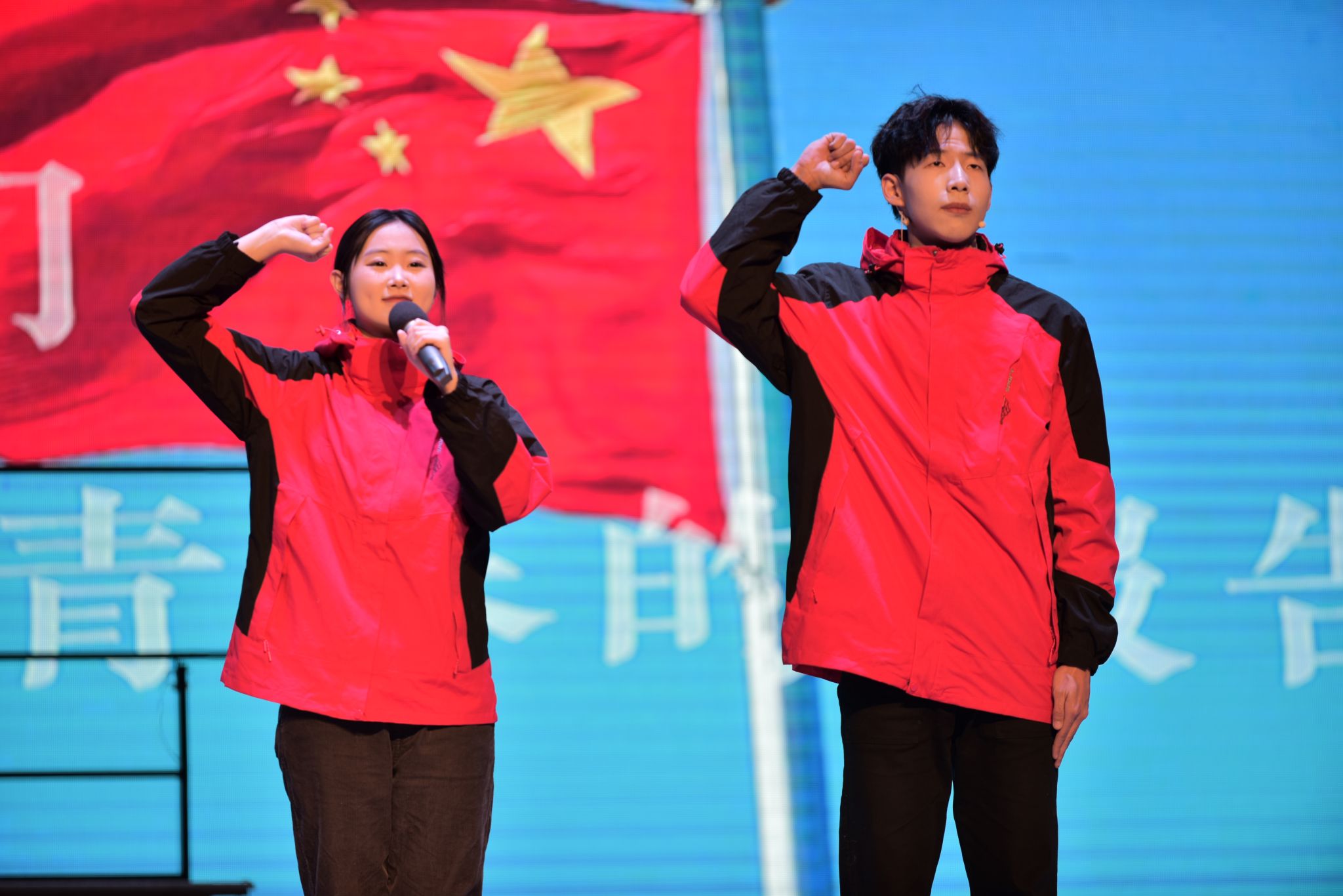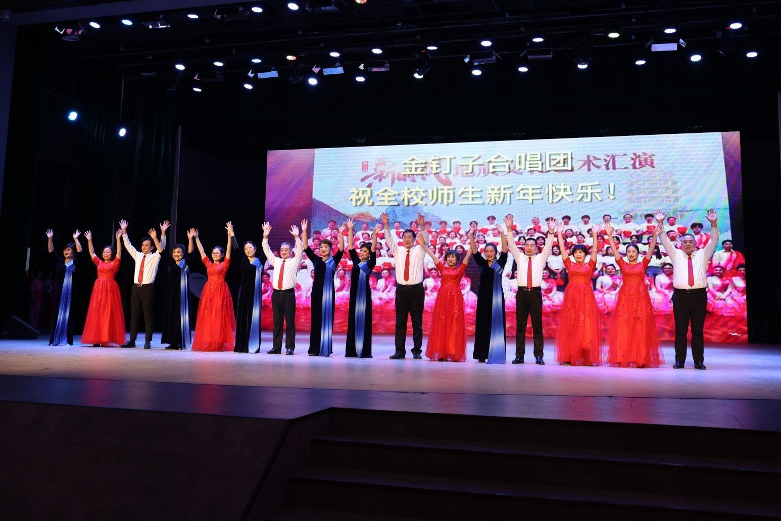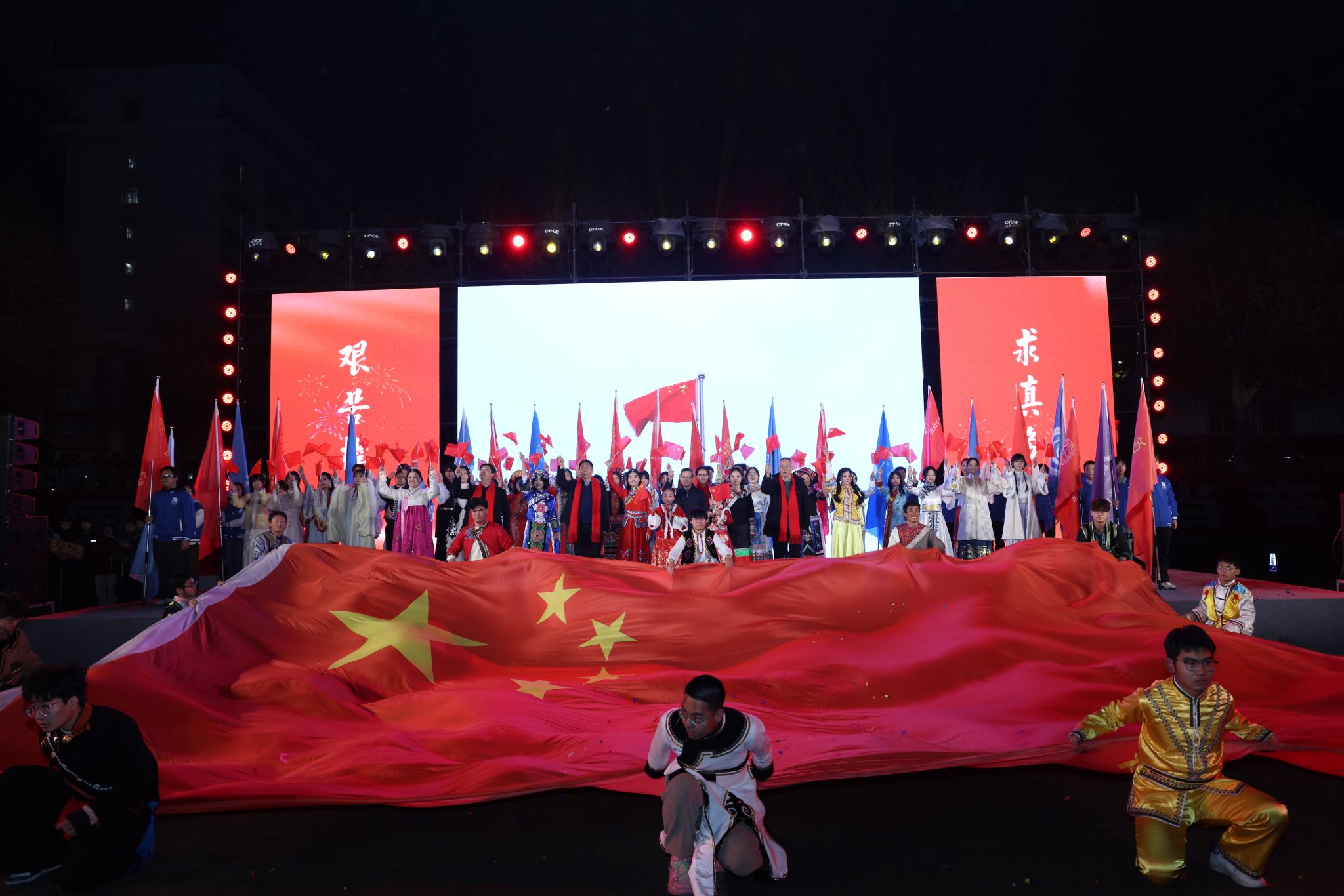 在辭舊迎新之際,兩校區50余位民族學生手握紅旗,身著民族服飾,與全體師生共同唱響新年第一聲《歌唱祖國》。