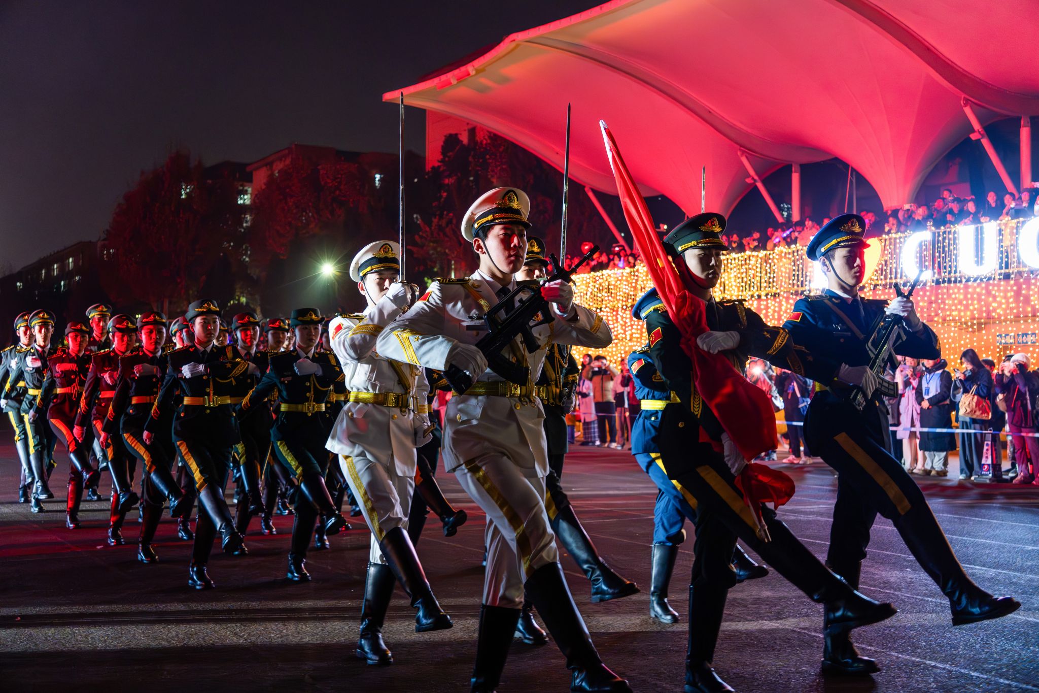 伴隨著軍樂團的演奏,國旗班邁著鏗鏘的步伐走向升旗臺,兩校區同時舉行升國旗儀式,在大家的注目下,五星紅旗冉冉升起。