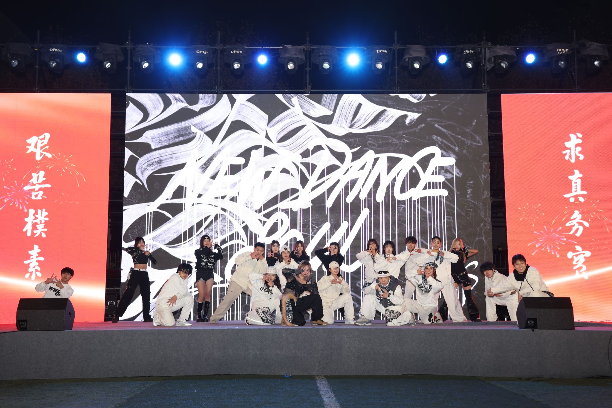 子時伊始,南望山西區操場的中央迎新嘉年華正在進行。NDS街舞社、模特隊、第五元素合唱團、舞蹈團、大學生龍獅團輪番登場。觀眾們揮舞著熒光棒,星星點點的光芒與璀璨的燈光交相輝映。