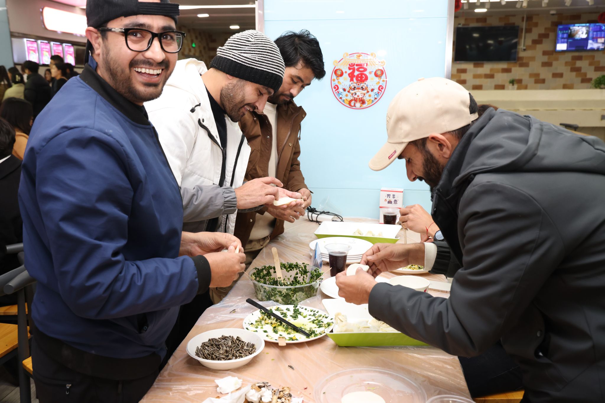 在紅燈籠、中國結與彩旗的裝飾下,未來城校區學一食堂二樓“年味滿滿”。晚上八點,我校校領導、鄂州市人民政府領導,與在場師生一起包餃子。五顏六色的餃子里,包的是全體師生對2025年美好的祝愿。幸運紅糖餃、抽取“2025未來錦鯉”、猜燈謎、新年傳話筒等活動也依次進行,現場歡聲笑語不斷。