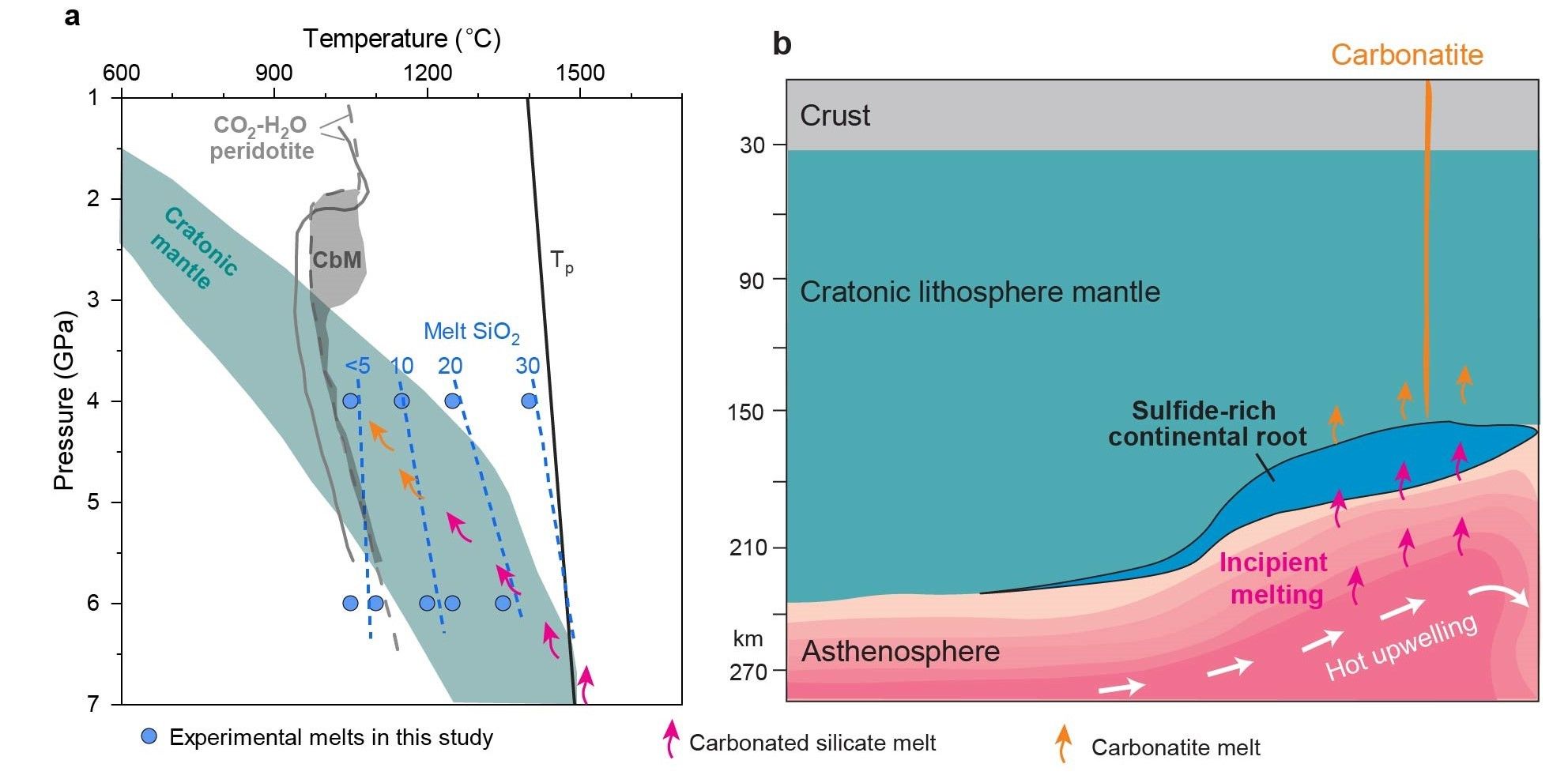該論文通過高溫高壓實驗?zāi)M克拉通(古老大陸)邊緣深部巖漿的演化過程,發(fā)現(xiàn)了克拉通邊緣區(qū)域深部存在富硫化物大陸根,結(jié)合全球火成碳酸巖和巖漿硫化物礦床的時空分布特征以及地球化學統(tǒng)計分析,揭示了富硫化物大陸根對火成碳酸巖和硫化物礦產(chǎn)形成與演化的控制作用。