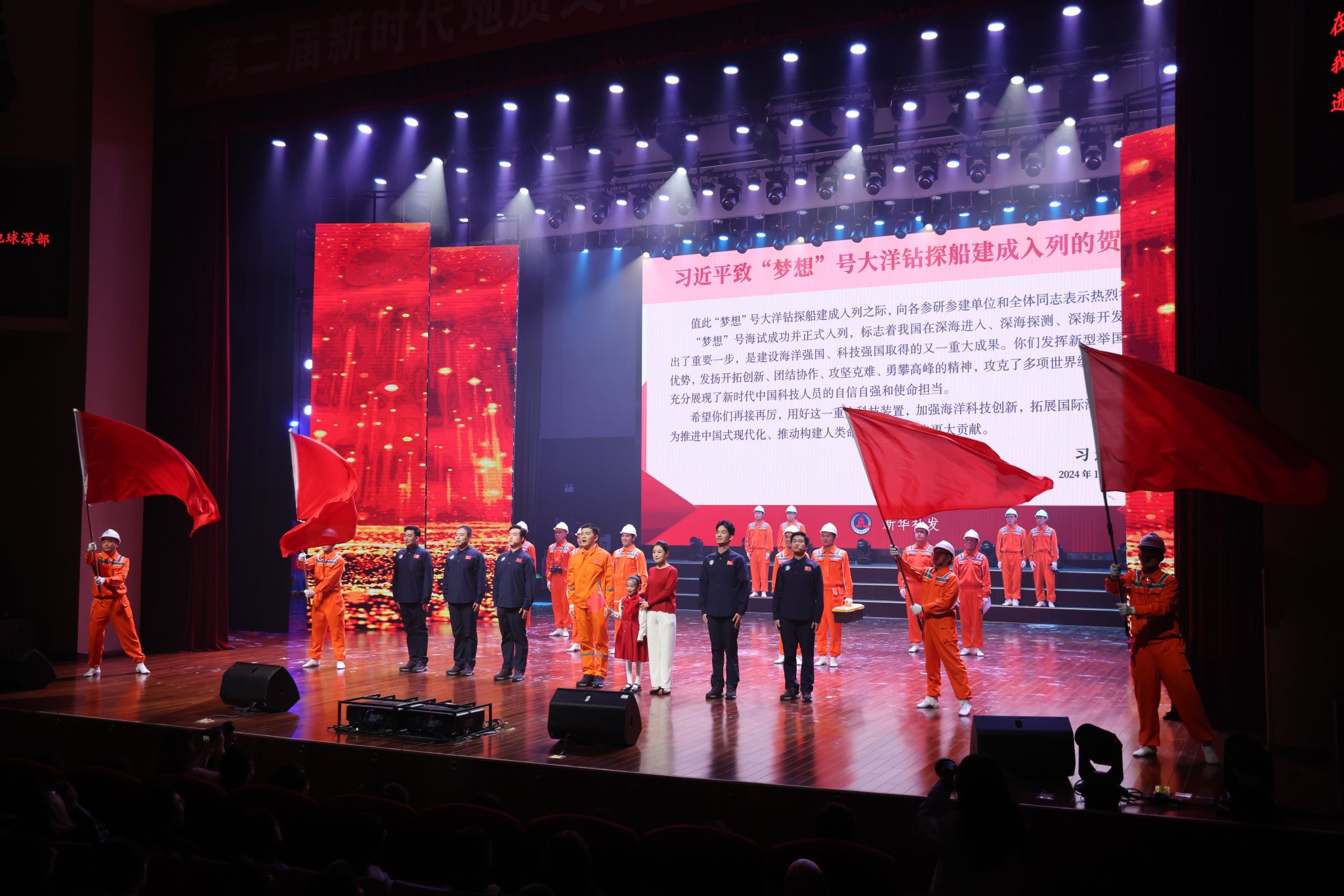2024年是新中國成立75周年,也是紀念李四光誕辰135周年。11月26日晚,第二屆全國地質文化藝術活動在我校盛大開幕,來自全國各地的地質工作者、文化藝術愛好者以及相關領域的專家學者,共赴這場地質與藝術交融的盛宴。書畫、視頻、匯演等多種藝術形式接連上演。其中,由廣州海洋地質調查局表演的情景舞蹈《向夢想啟航》,再次向觀眾展現了“夢想”號建造背后的故事。