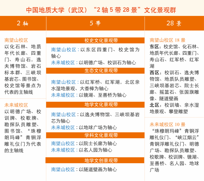 地質文化不止內化于地大人的心中,更外化于校園的每一處空間。漫步校園,地質文化元素隨處可見、觸手可及。逸夫博物館、地質隊員雕塑、地質年代長廊、化石林、院士長廊、地球廣場、攀登雕塑……由“校史文化景觀帶”“生態文化景觀帶”“地學文化景觀帶”“學科文化景觀帶”“地學文創景觀帶”等交織而成的文化景觀群,宛如一幅幅動人的圖景,生動展現了學校深厚的地質文化根基、悠久的地質文化積淀和獨特的地質文化底蘊。