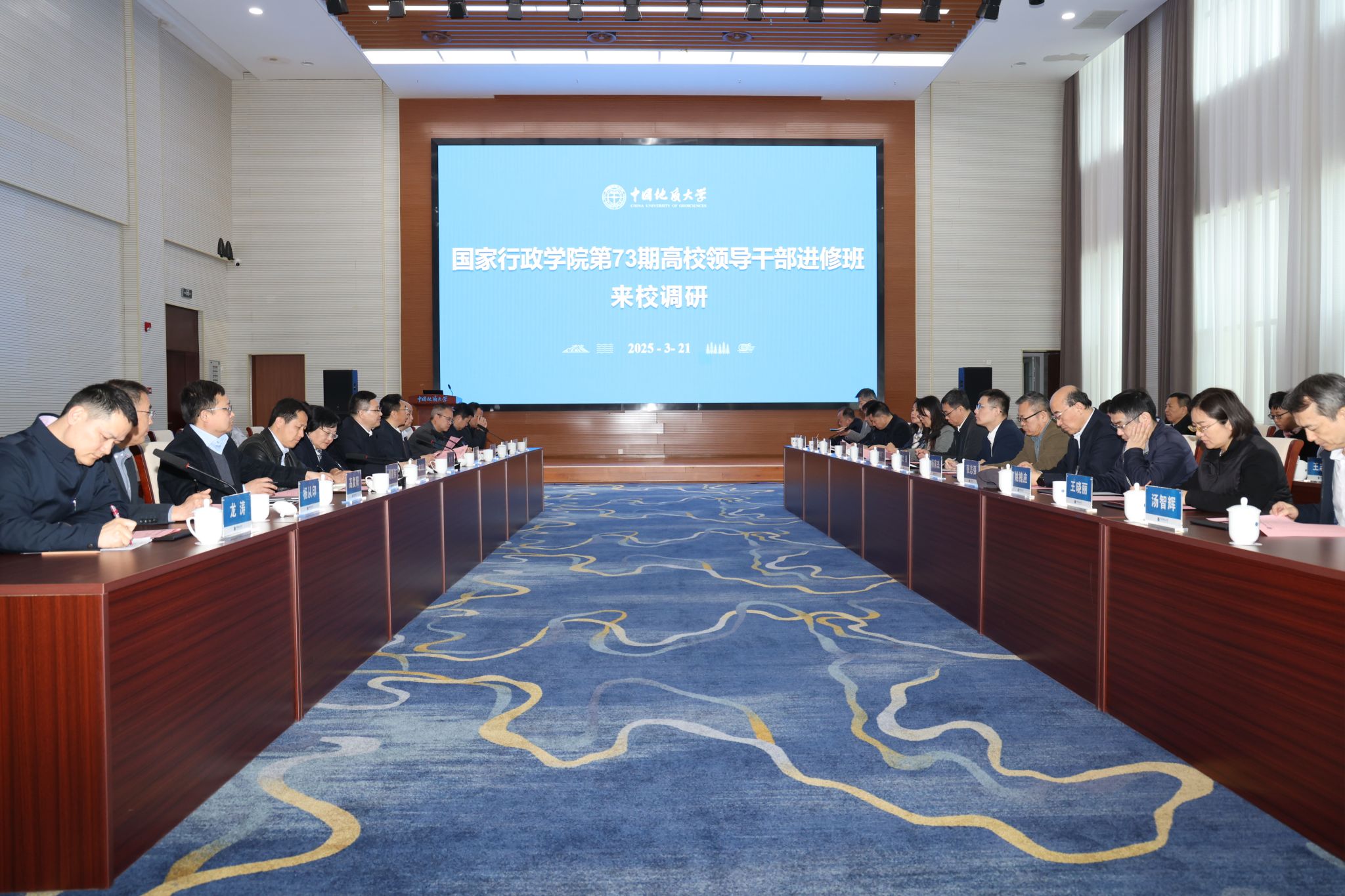 地大新聞網訊 (記者 孫彥欽)3月21日,國家教育行政學院第73期高校領導干部進修班來校調研座談。校黨委書記劉杰,黨委副書記王甫,黨委常委、組織部部長陳文武,相關部門負責人參加調研座談。