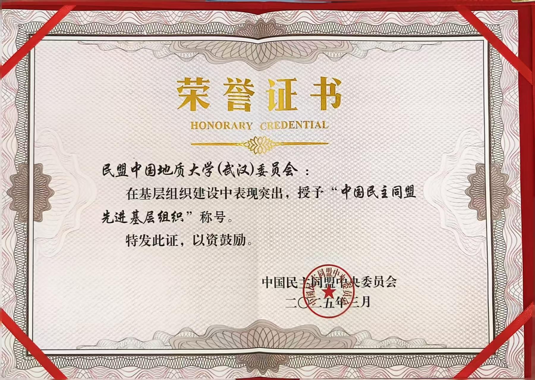 民盟地大委員會榮獲民盟中央“先進基層組織”稱號,是唯一一個獲此榮譽的在鄂部屬高校民盟基層組織。