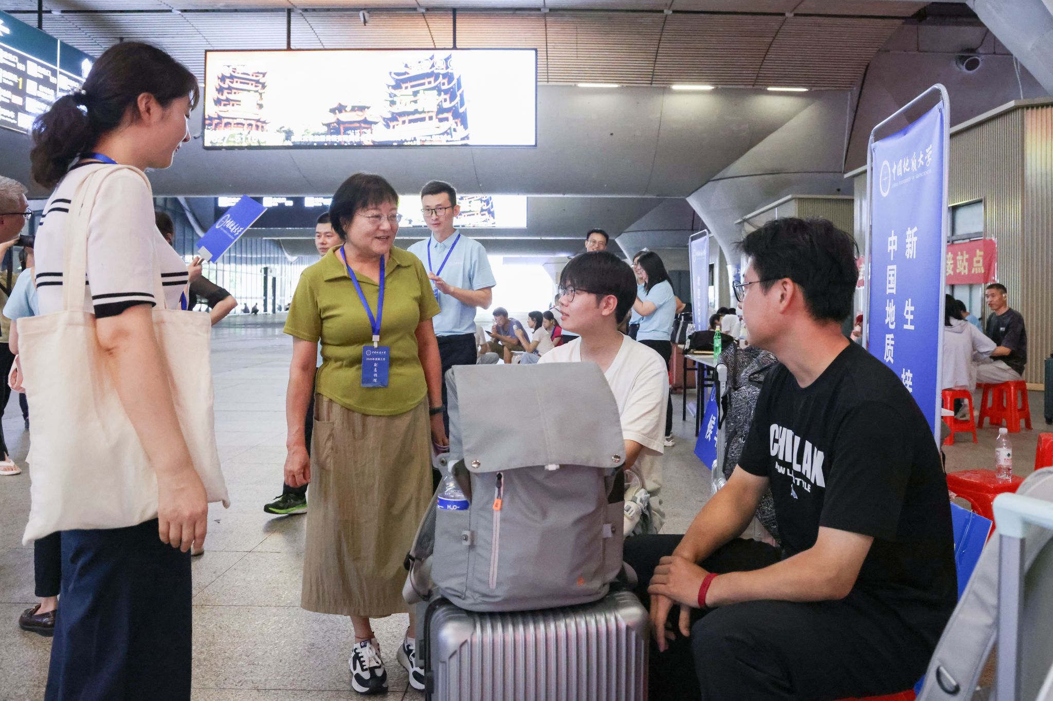 珠寶學院珠寶鑒定專業大二的本科生曹明燦,冒著烈日守候在新生接站點,為到站的新生和家長提供指引?!翱吹叫律瘹馀畈?、充滿好奇心的面孔,也回憶起來我初入校園的景象,當時也有很多熱心的志愿者迎新?!辈苊鳡N說,幫助他人,自己也獲得了認同感和幸福感。