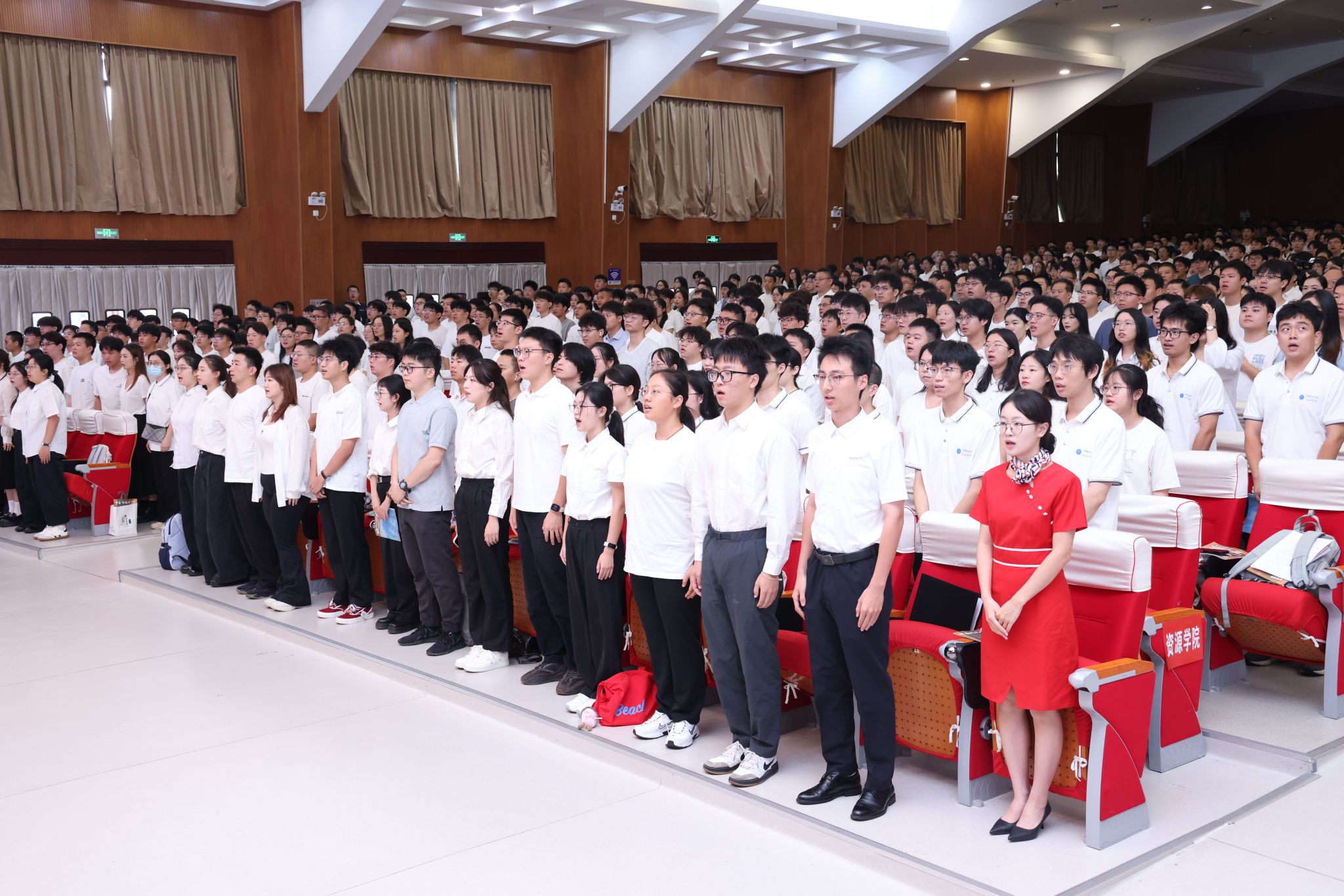 與會校領(lǐng)導(dǎo)、院士為2025級研究生新生代表贈送校徽校標(biāo)。