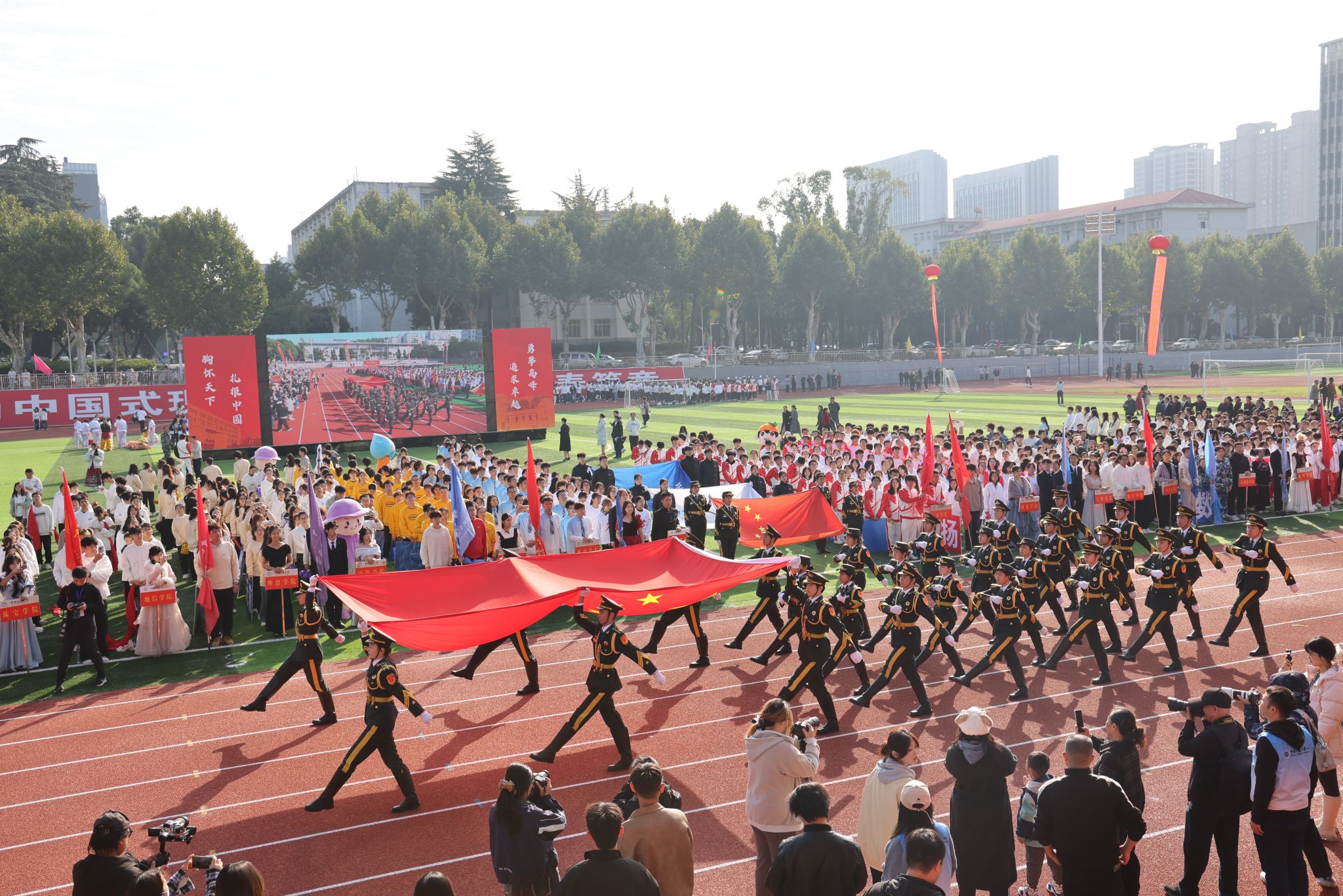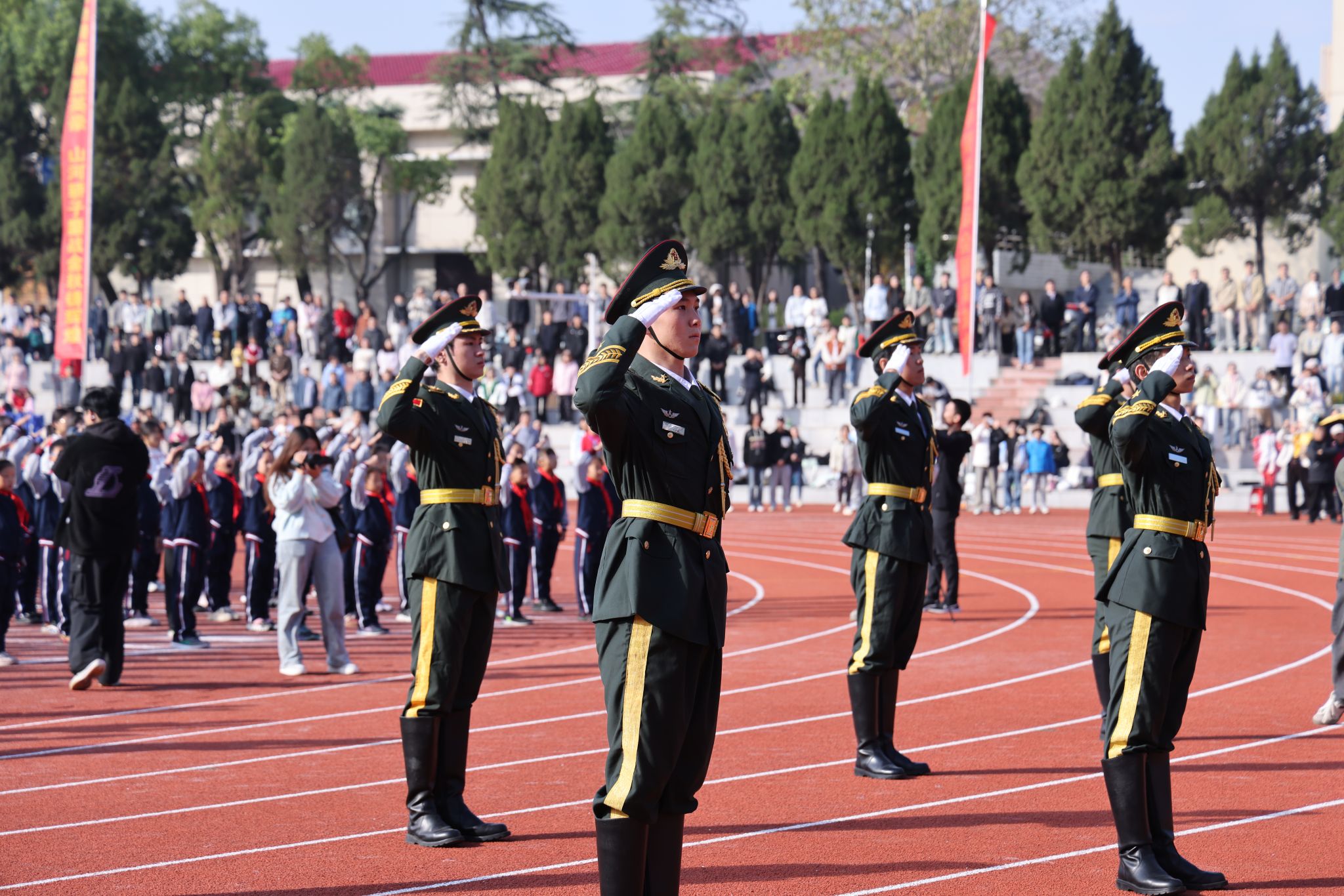 國旗班邁著鏗鏘有力的步伐,護送國旗出場,繞場展示,全體師生深情凝望,愛國之情在心中澎湃涌動。