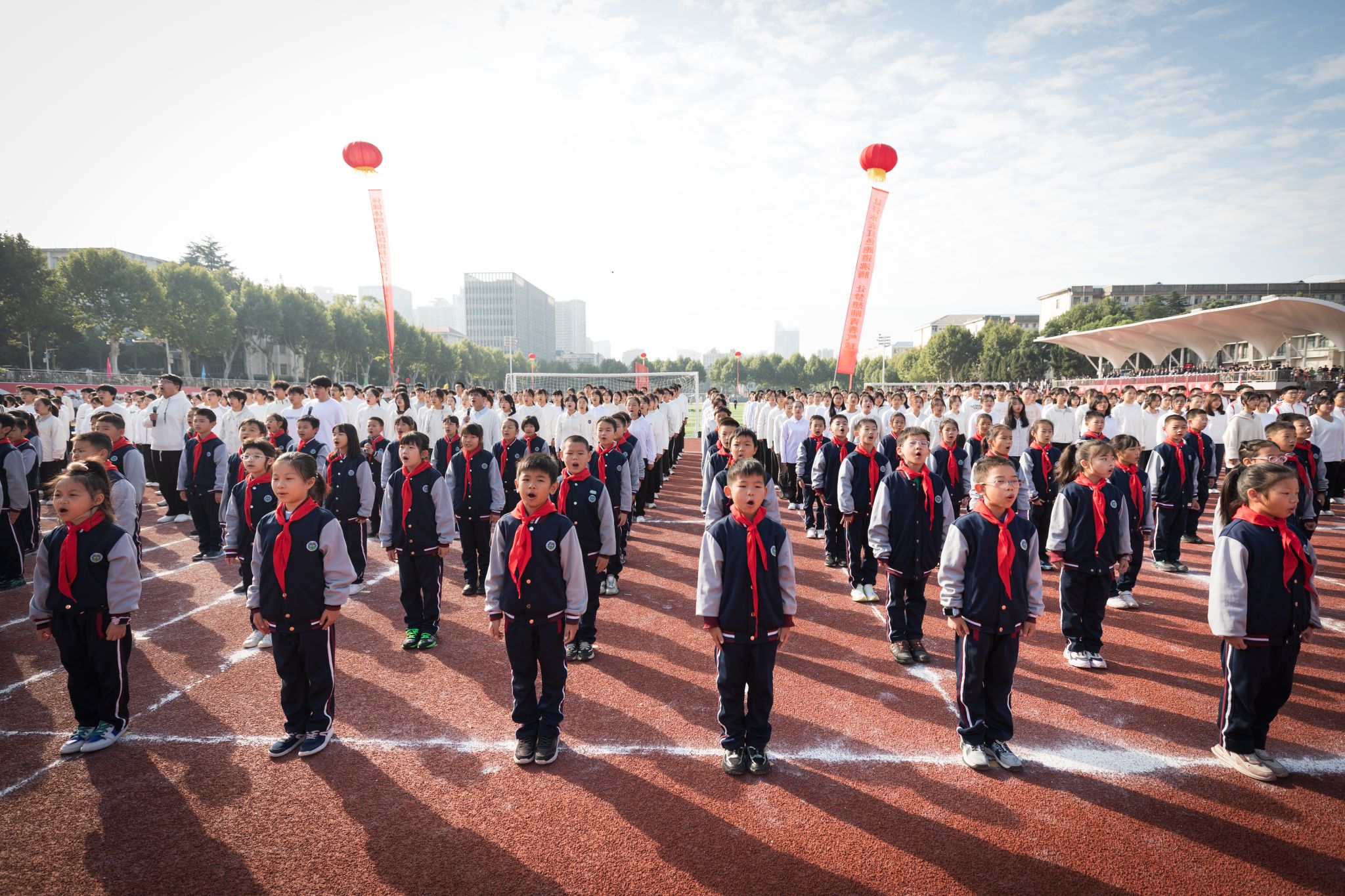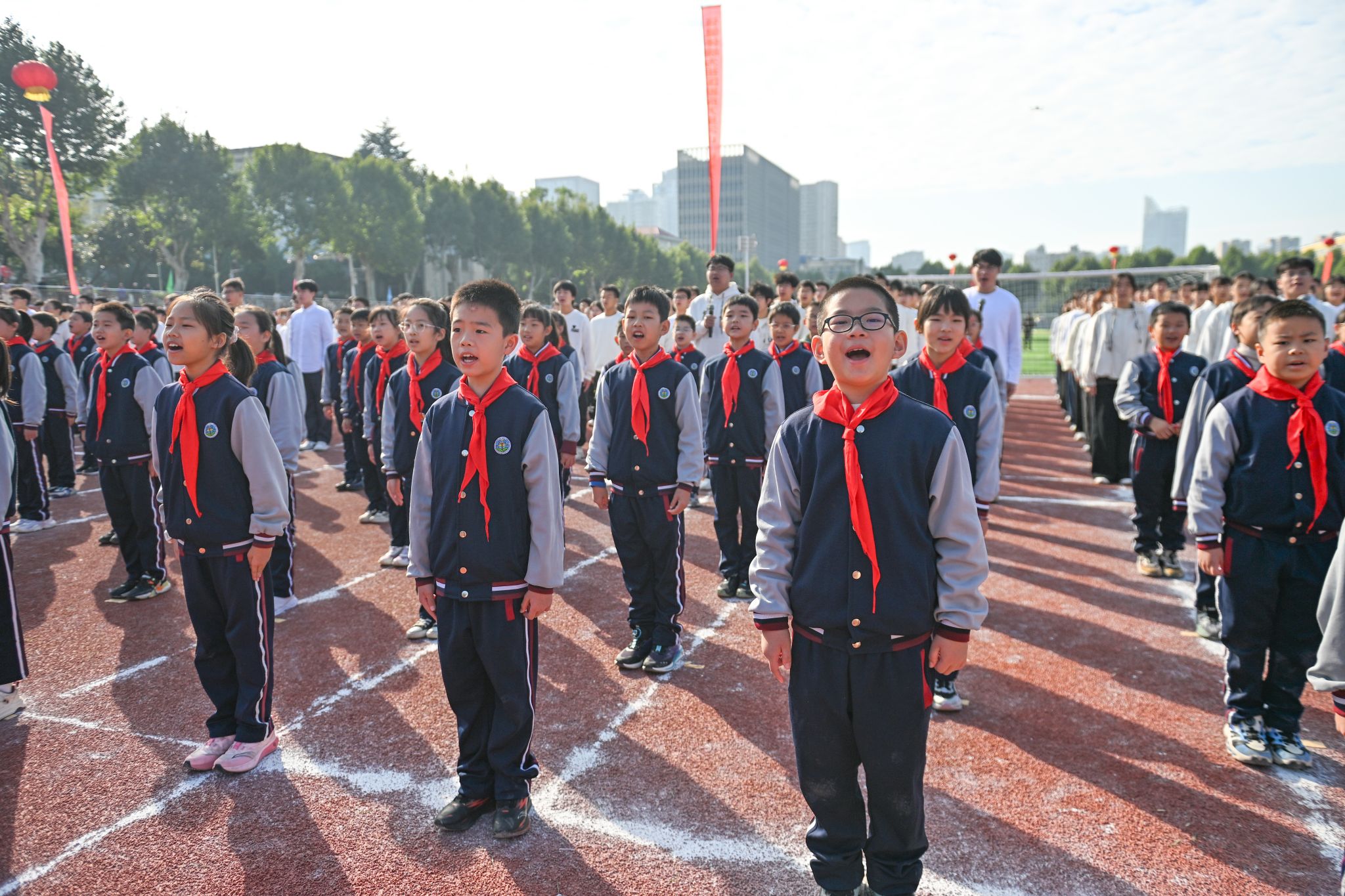 現場舉行升國旗儀式,少先隊員行隊禮,全體師生肅立并行注目禮。