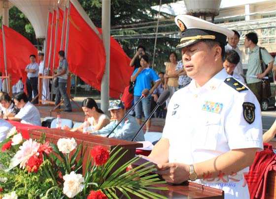 一、9 月21日上午,我校2010級新生軍訓(xùn)匯報暨開學(xué)典禮在西區(qū)操場隆重舉行。大會在莊嚴的升旗儀式中拉開帷幕。海軍工程大學(xué)訓(xùn)練部部長高敬東少將,海軍工程大學(xué)船舶與動力學(xué)院政委劉英輝大校,海軍工程大學(xué)船舶與動力學(xué)院學(xué)員三旅旅長梁建勇大校、三旅政委李巖大校等,中國科學(xué)院院士趙鵬大、殷鴻福,第九屆、第十屆全國人大代表王亨君,校領(lǐng)導(dǎo)郝翔、張錦高、丁振國、邢相勤、朱勤文、傅安洲等參加了2010級開學(xué)典禮。