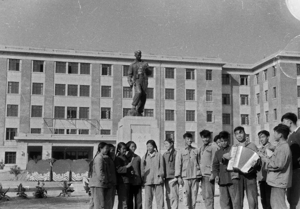 1960屆畢業生離校前在地質勘探隊員雕像前合唱《勘探隊員之歌》。