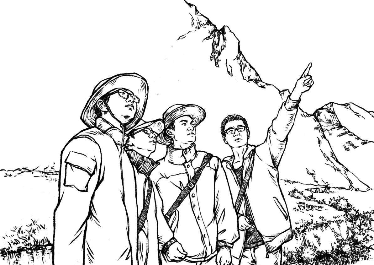 創作繪本《山河作證》的過程,并非一帆風順。去年12月,針對20多張創作草圖,陳華文并不滿意,地質人的精氣神在畫稿中,沒有達到預想的表現效果,他甚至一度想放棄創作。但是一想到師生們在崇山峻嶺跋涉的身影和無畏的攀登精神,他又鼓起了創作的勇氣。每一幅畫稿,從草圖醞釀到最初定稿,都反反復復地修改,有的畫稿修改多達十多次。