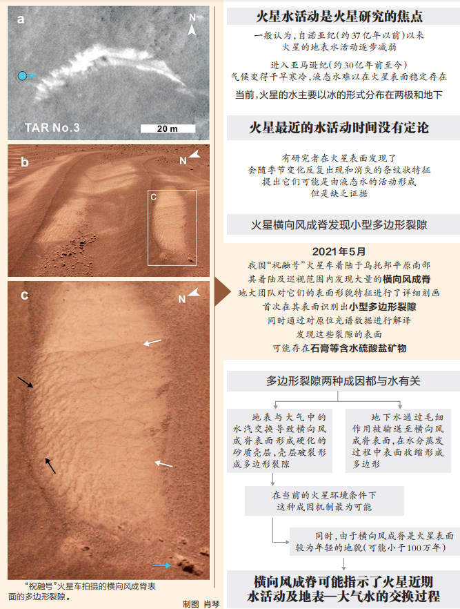 “由于橫向風成脊是火星表面較為年輕的地貌,可能小于100萬年,而且這些多邊形裂隙在橫向風成脊演化的后期形成,所以我們認為,這可能指示了火星近期水活動及地表—大氣水的交換過程,為研究火星在當前寒冷干旱氣候條件下的水循環提供了線索。”趙健楠坦言,為了進一步確認火星近期是否有水活動,還需要獲得更多的探測數據,我國將在2030年左右從火星采樣并返回地球研究,那時將有望進一步確認火星的水活動歷史。