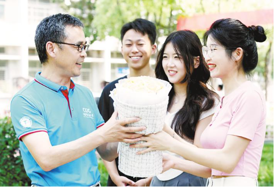 9月10日,中國地質大學(武漢)工程學院學生,為博導老師竇斌教授(左一)敬獻鮮花,以感謝恩師三尺講臺傳授知識育桃李。 (湖北日報全媒記者 張鴻 通訊員 屠傲凌 攝)