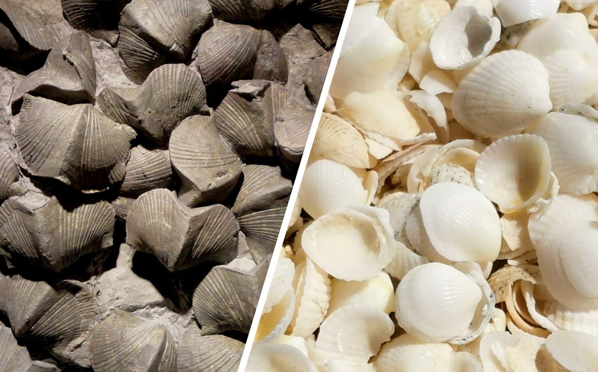 左圖:美國泥盆紀腕足類化石。圖片源自Daderot(Wikimedia Commons)。右圖:西澳大利亞貝殼灘(shell beach)的現代雙殼類,陳中強/攝