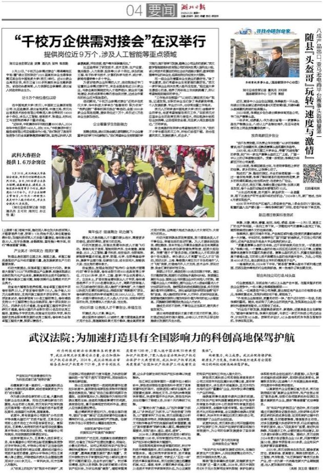 活動期間,“千校萬企供需對接會”還同步在武漢大學、華中科技大學舉辦“珞櫻有約 職為你來”“筑夢遠航”“春季校園雙選會”等活動,全國1600余家企業現場招聘,提供崗位近7萬個,吸引近5萬名畢業生參加活動。