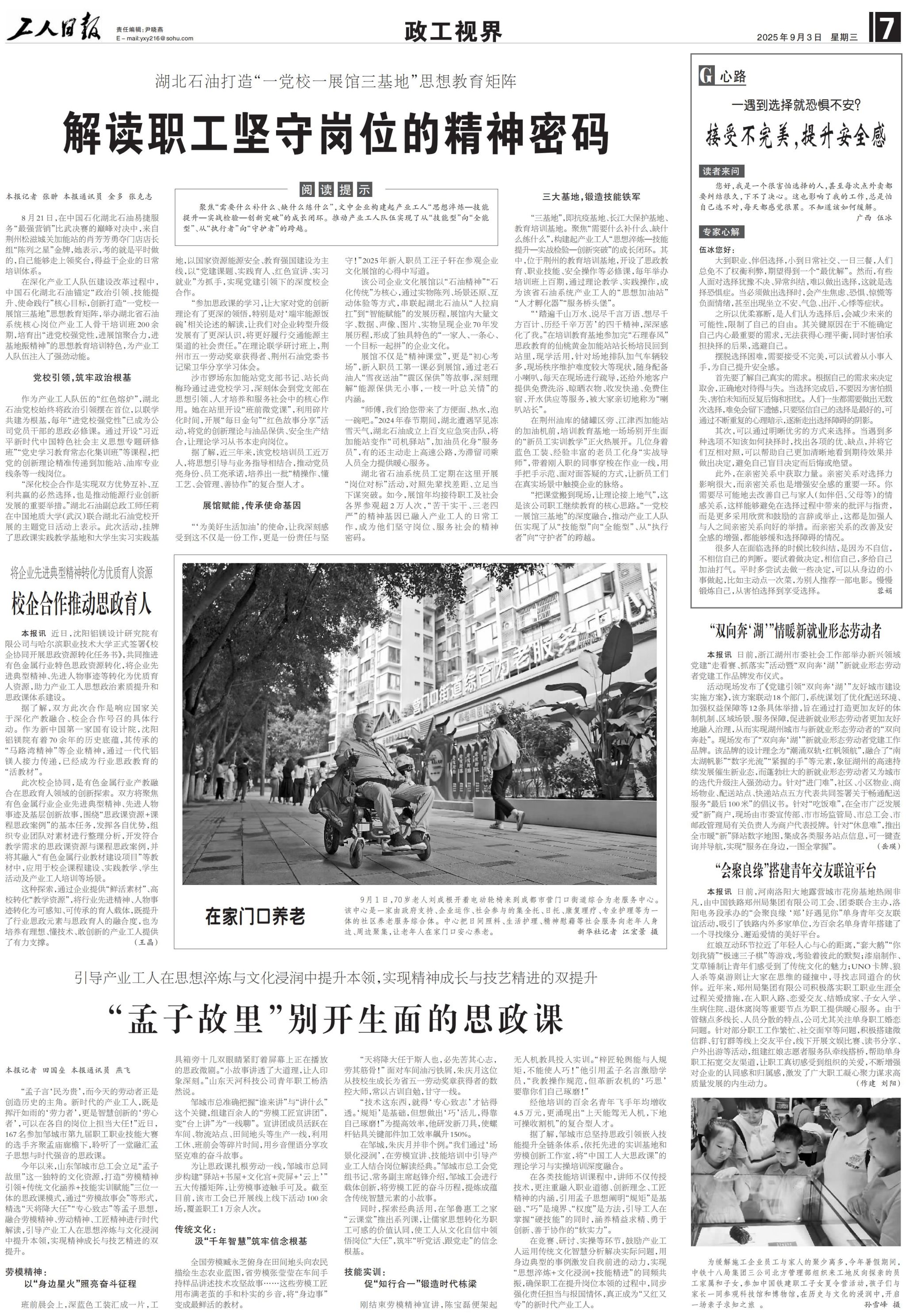 “三基地”,即抗疫基地、長江大保護基地、教育培訓基地。聚焦“需要什么補什么、缺什么練什么”,構建起產業工人“思想淬煉—技能提升—實戰檢驗—創新突破”的成長閉環。其中,位于荊州的教育培訓基地,開設了思政教育、職業技能、安全操作等必修課,每年舉辦培訓班上百期,通過理論教學、實踐操作,成為該省石油系統產業工人的“思想加油站”“人才孵化器”“服務橋頭堡”。