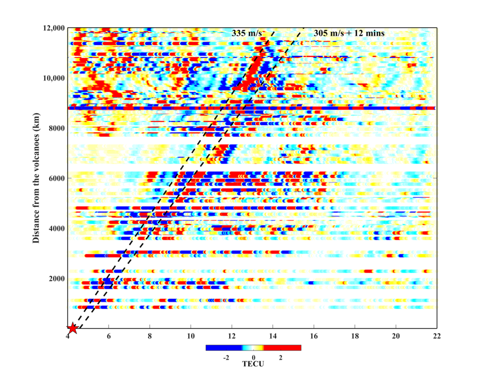 北斗同步衛星捕捉到的火山噴發后的電離層擾動領先與近地表大氣誘發的電離層擾動 (305 m/s + 12 minutes)