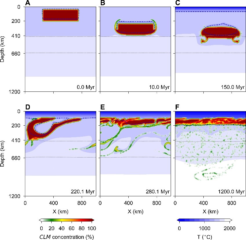 地球早期地幔溫度高,高程度部分熔融導致殘余的地幔虧損程度較高,因此具有化學成分控制的高浮力(產生向上的正浮力),逐漸聚集在地球淺部。隨著地表低溫熱邊界層的向下生長,熔融殘余的溫度變低,形成高粘度巖石圈。低溫產生的冷縮效應會導致密度顯著增加,因此產生向下的負浮力。該作用逐漸抵消化學成分相關的正浮力,從而使冷巖石圈失穩和向深部沉沒,被稱為拆沉作用(圖2 A-C)。拆沉的巖石圈進入地幔后,被地幔高溫加熱,使得溫度產生的負浮力逐漸被化學成分浮力超越,反而抑制下沉,導致被加熱的古老熔融殘余物質上浮(圖2 D),并再度合并到淺部的巖石圈底部(圖2 E-F)。拆沉和上浮之間的時間間隔可以長達數千萬年到數億年不等。在這期間,淺部巖石圈在板塊構造運動驅動下可發生數千公里移動,深部的古老巖石圈殘片也可以在地幔流驅動下發生大規模水平位移。因此上浮的巖石圈殘片可以合并到不同年齡的克拉通、造山帶或者大洋巖石圈底部形成復雜的巖石圈結構。