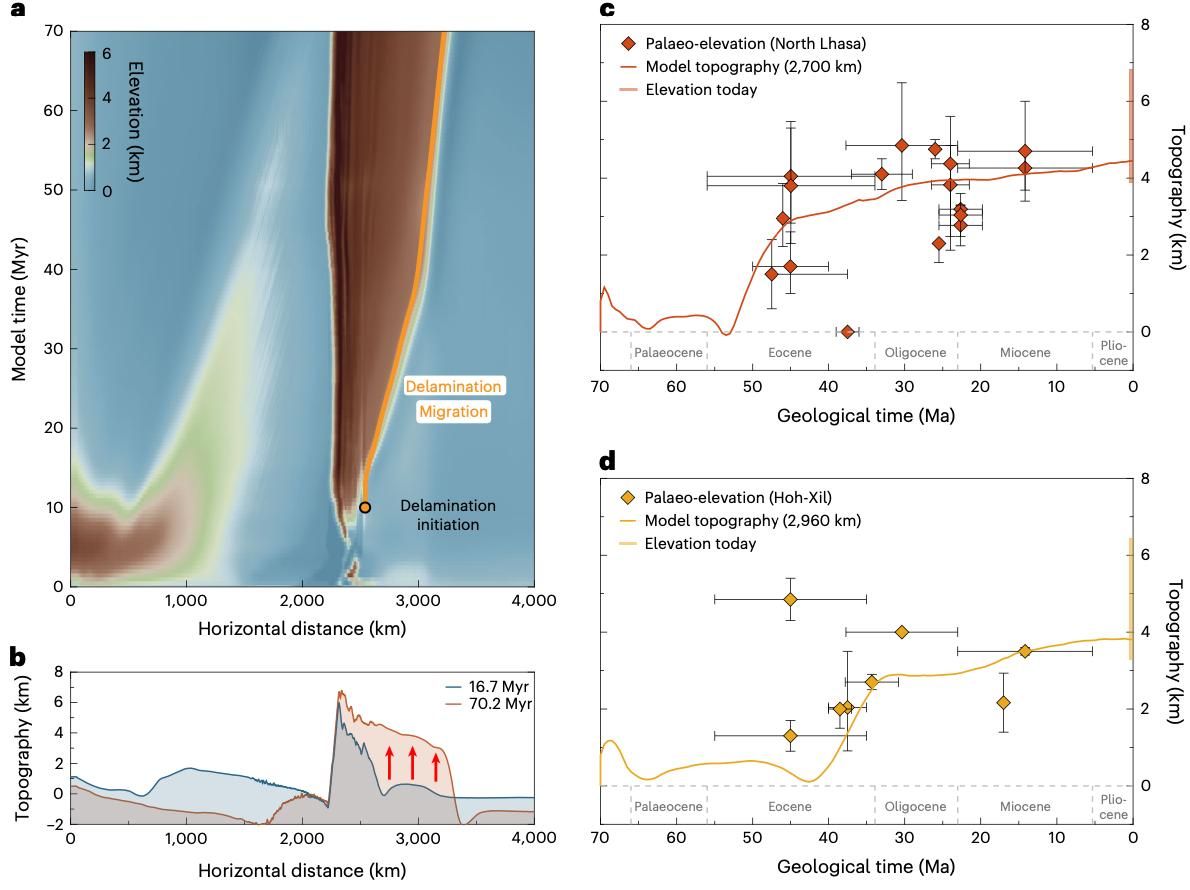 青藏高原的隆升具有三大一階特征,包括高原的多階段隆升,新生代巖漿活動的北向遷移以及高原底部地震波低速異常。巖石圈地幔拆沉所伴隨的地表響應解釋了高原的古高度研究結(jié)果以及巖漿活動的北向遷移模式 (圖2c,d和圖3a)。同時,巖石圈地幔拆沉的結(jié)果與現(xiàn)今高原底部巖石圈結(jié)構(gòu)一致,包括地震層析成像顯示的地震波低速異常和接受函數(shù)圖像揭示的雙向結(jié)構(gòu)與地殼厚度 (圖3b)。這些對比有力地證明了,上覆板塊巖石圈地幔拆沉這一動力過程塑造了整個印度—歐亞板塊碰撞體系,是青藏高原生長背后的驅(qū)動力,同時該深部動力過程的提出,也為地球歷史上富巖漿活動的造山事件提供了新的地球動力學解釋。