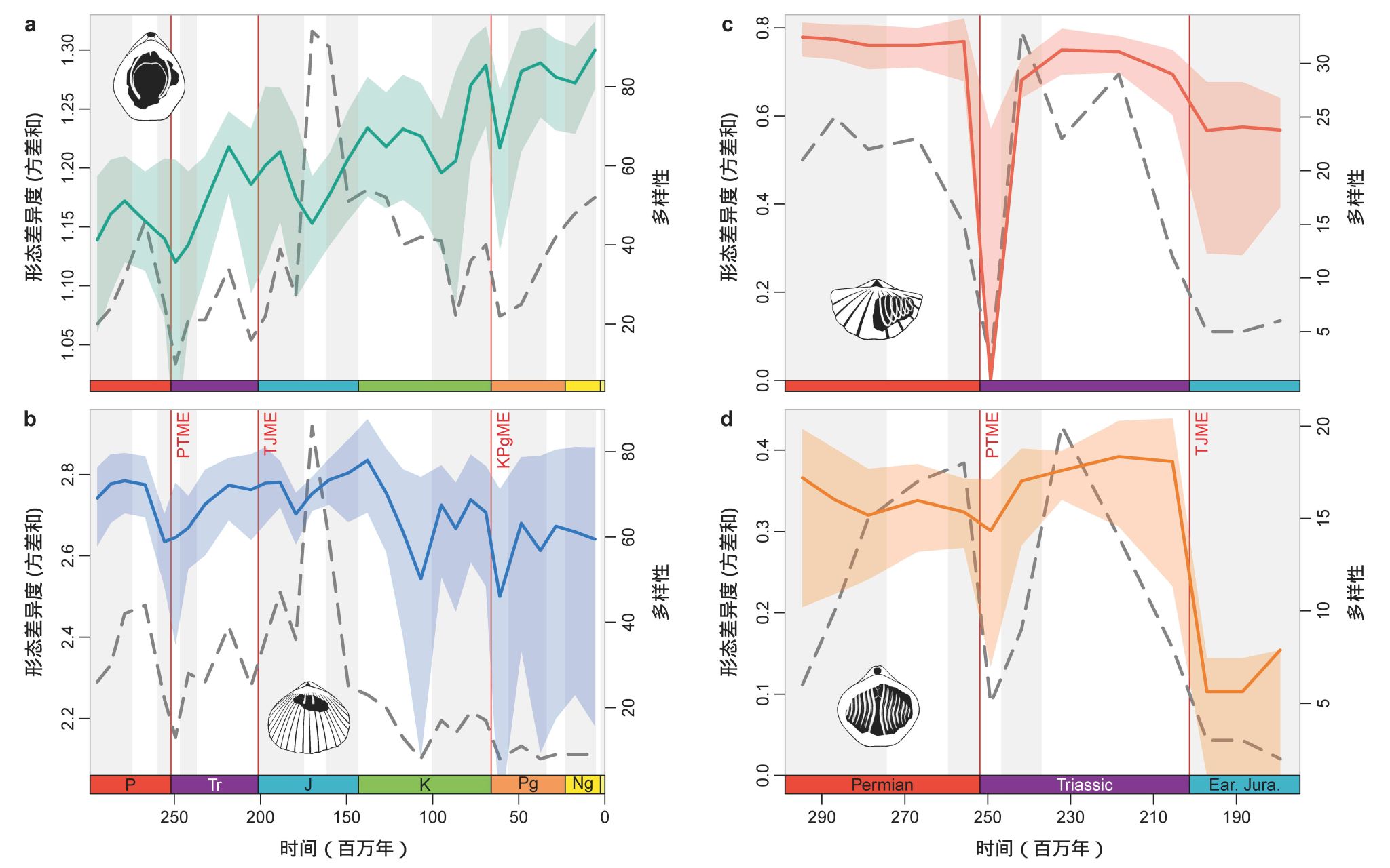 本研究還對(duì)比了三次大滅絕事件(二疊紀(jì)末大滅絕、三疊紀(jì)末大滅絕、白堊紀(jì)末大滅絕)對(duì)腕足動(dòng)物形態(tài)演化的影響,發(fā)現(xiàn)不同類群在不同滅絕事件中的表現(xiàn)有很大差異,揭示了大滅絕事件對(duì)生物影響的異質(zhì)性和復(fù)雜性。