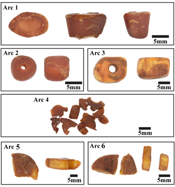圖2 本研究中所涉及的古代琥珀器物照片:Arc 1為宋代琥珀制品,Arc 2為明代琥珀制品,Arc 3~4為清代琥珀制品