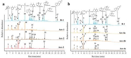 圖4 通過Py-GC/MS分析的不同時期出土琥珀制品的總離子色譜圖