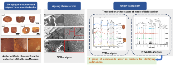 中國的琥珀藝術距今至少已有三四千年的歷史,關系著古代中西方貿易往來及文化的交流融合,因而對出土琥珀文物進行產地溯源具有重要的歷史文化意義。同時,為科學、持久地保存琥珀文物,最大限度地延緩琥珀文物在埋藏和保存過程中發生的劣化,亟需對出土琥珀的老化特征進行識別并厘清其老化降解機理。研究團隊采用傅里葉變換紅外光譜(FTIR)、掃描電子顯微鏡(SEM)和熱裂解氣相色譜質譜(Py-GC/MS)等對中國宋、明、清三個時期出土的多件琥珀制品進行了溯源及老化特征研究,探索了琥珀制品的自然老化機理。