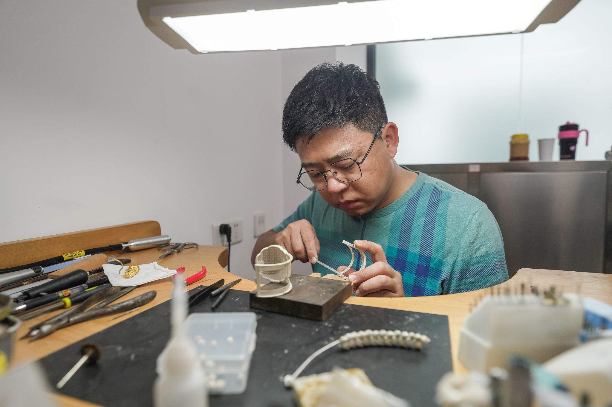 任開(kāi)從事珠寶首飾專(zhuān)業(yè)20余年,也見(jiàn)證了珠寶首飾專(zhuān)業(yè)在中國(guó)高等院校從無(wú)到有、從有到專(zhuān)的轉(zhuǎn)變過(guò)程。他常說(shuō):“首飾雖小,但也很大”。 “小”在于它點(diǎn)綴著人們的妝容,是最珍貴材料的體現(xiàn),是最精妙技藝的集合。“大”在于它承載了人們對(duì)一切美好的愿望和心靈的依托;是科學(xué)與藝術(shù)、材料與文化、物質(zhì)與精神的結(jié)合。一件精美的珠寶首飾的誕生需要以下幾個(gè)步驟:靈感發(fā)掘,設(shè)計(jì)構(gòu)思,材料備制,精工細(xì)作,表達(dá)呈現(xiàn)。每一步都是從業(yè)者凝聚無(wú)數(shù)心血的積累,是匠人精神的具體體現(xiàn)。作為21世紀(jì)珠寶首飾的創(chuàng)作者、教育者、傳承者,不僅要精通本專(zhuān)業(yè)所有知識(shí),要有扎實(shí)的動(dòng)手實(shí)踐能力,還要突破傳統(tǒng)手工藝的舊式傳承,將手工技藝中“只可意會(huì)不可言傳的”絕活和寶貴經(jīng)驗(yàn),用最直白的語(yǔ)言,毫無(wú)保留地傳授給眾多學(xué)生。任開(kāi)將現(xiàn)代教育方法與師承授業(yè)相結(jié)合,心手相傳。十多年來(lái),他培養(yǎng)出眾多優(yōu)秀學(xué)生,有些考入中央美術(shù)學(xué)院、英國(guó)皇家藝術(shù)學(xué)院等國(guó)內(nèi)外著名院校繼續(xù)深造,有些成為當(dāng)代知名設(shè)計(jì)師或藝術(shù)創(chuàng)作者,有些進(jìn)入國(guó)內(nèi)專(zhuān)業(yè)院校任職,將知識(shí)和經(jīng)驗(yàn)繼續(xù)傳承下去。