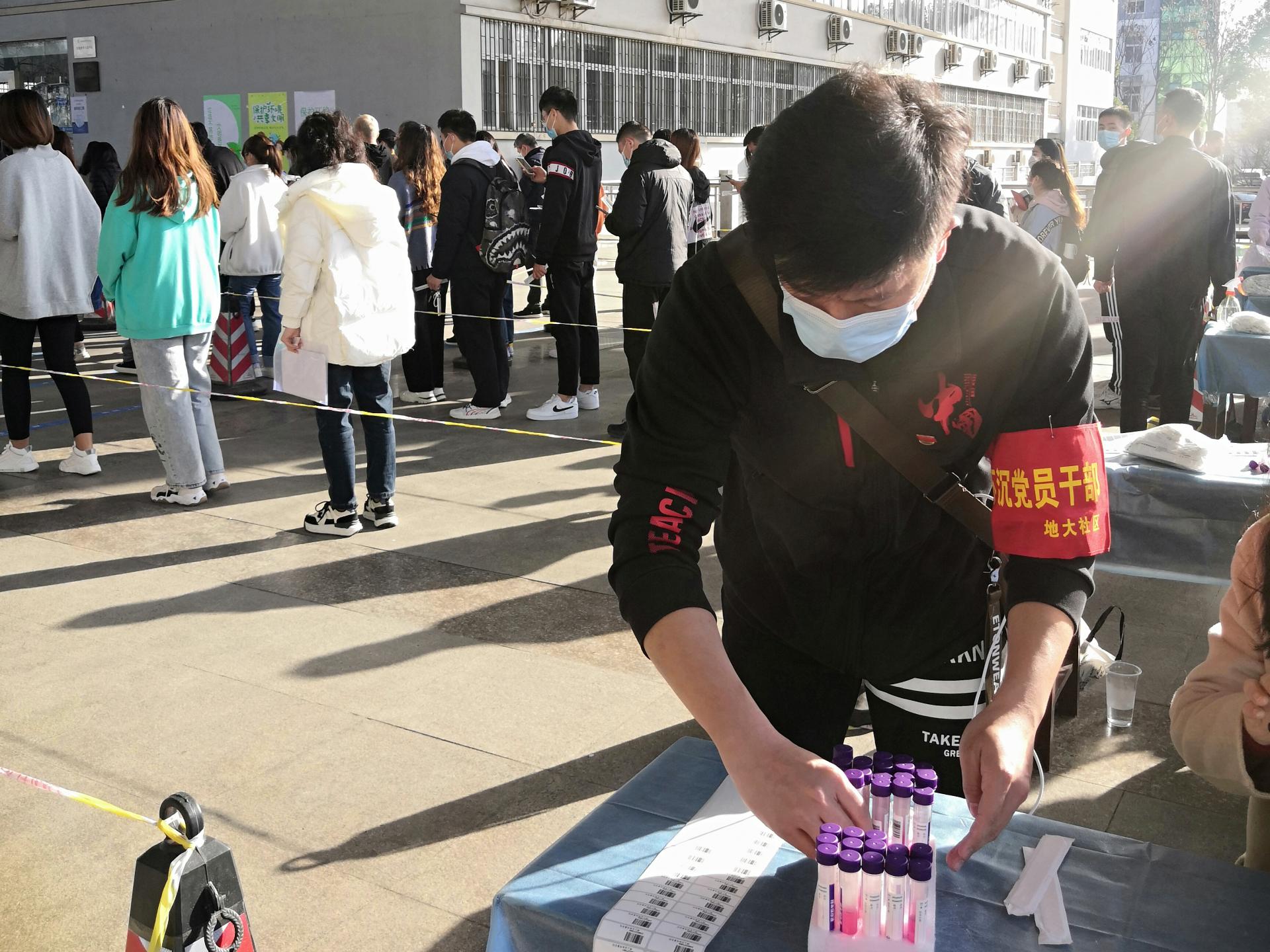開學至今,學校南望山校區(qū)進行了八輪全員核酸檢測,未來城校區(qū)進行了十三輪全員核酸檢測。在此過程中,黨員同志始終沖鋒在前,承擔了布置場地、數(shù)據(jù)錄入、師生引導、秩序維護等大量工作,黨徽在疫情防控一線熠熠生輝,黨旗在疫情防控一線高高飄揚,為學校順利完成核酸檢測工作提供了堅實保障。