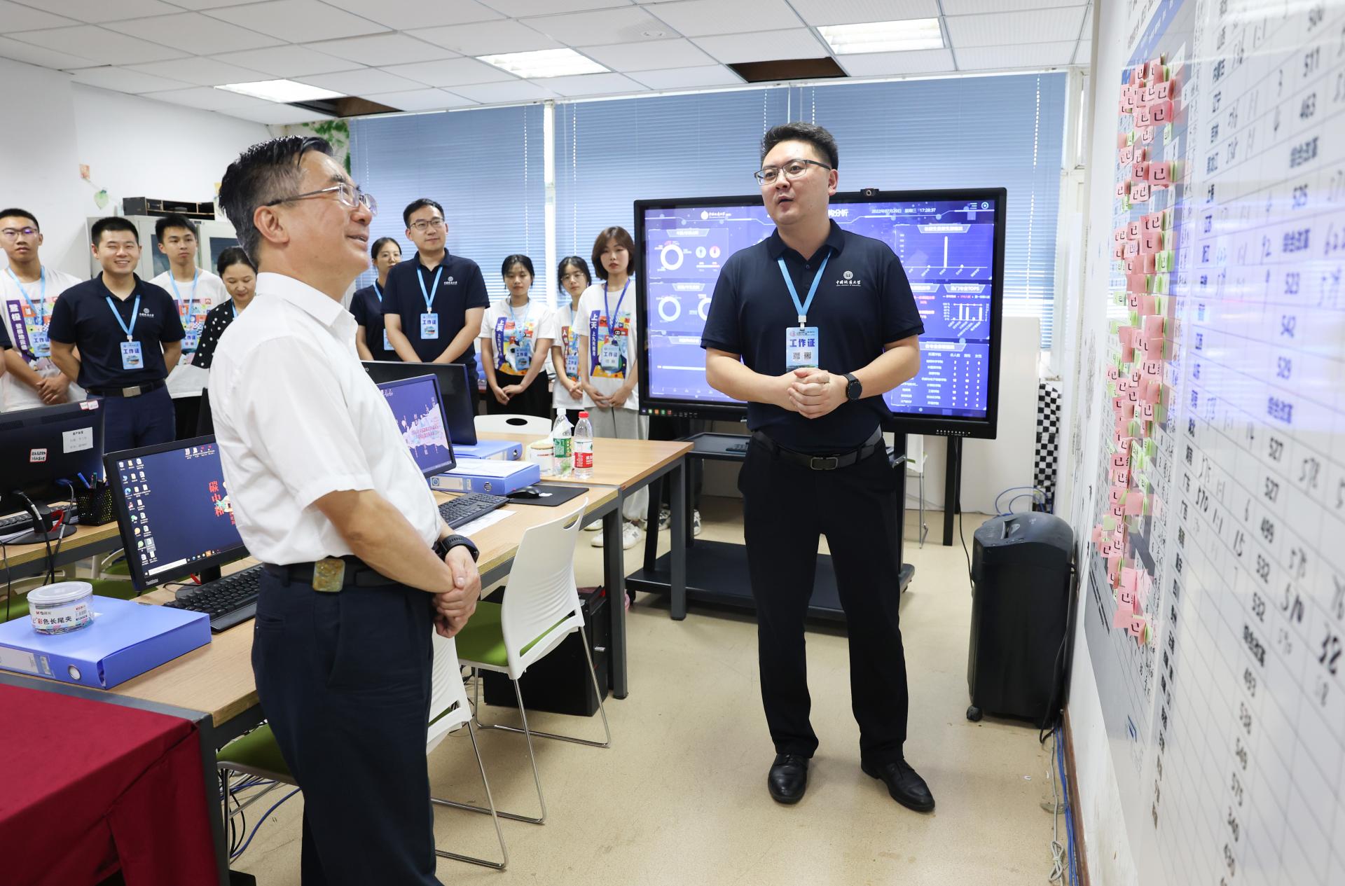 在2022年高考遠程錄取工作現場,王焰新認真聽取了招生錄取工作的進展匯報,對前期招生宣傳、已錄取批次生源情況、錄取工作人員分工、工作保障等進行全面了解,對全體招生錄取人員辛勤工作、敬業奉獻的精神給予肯定。