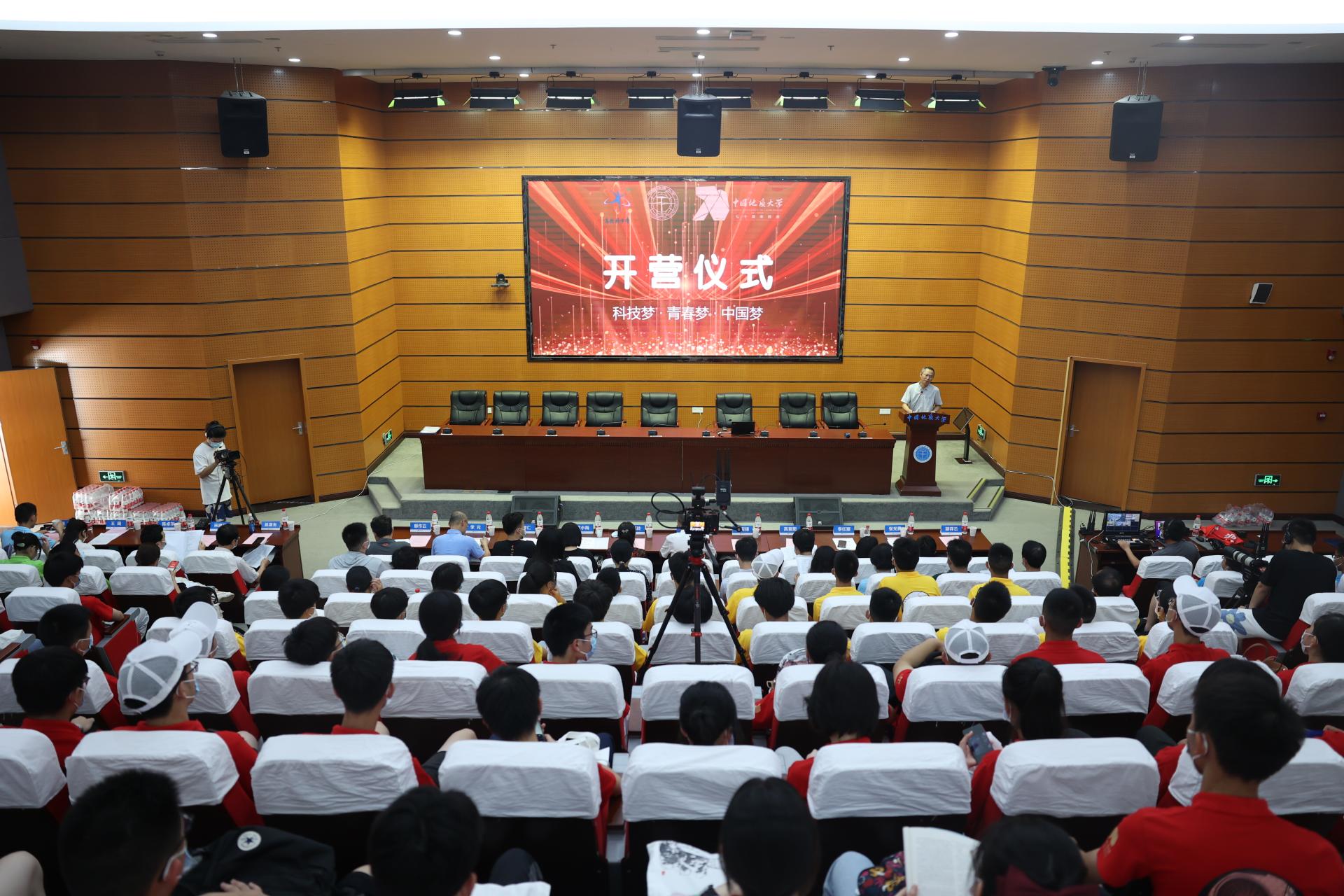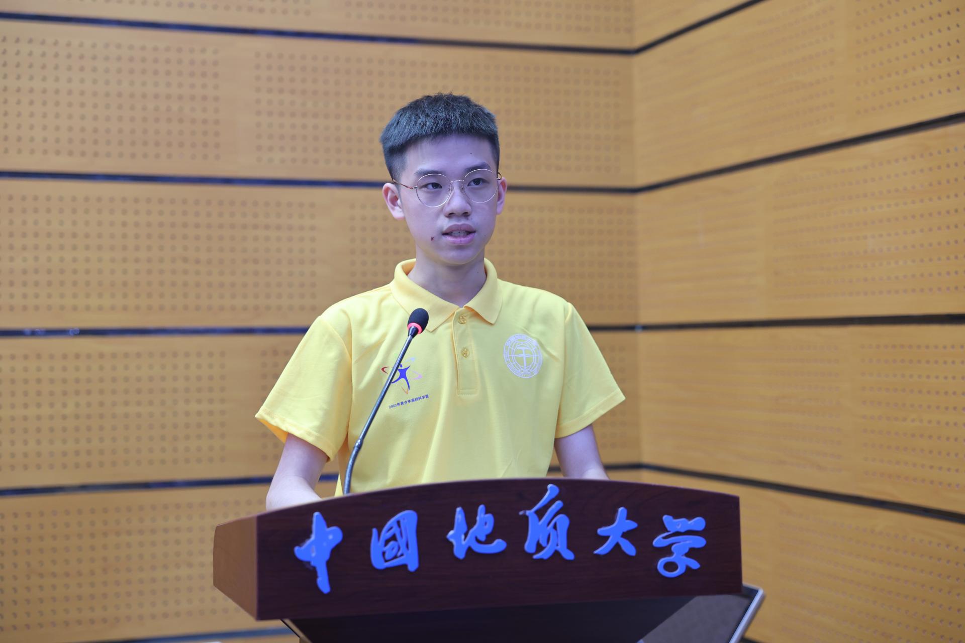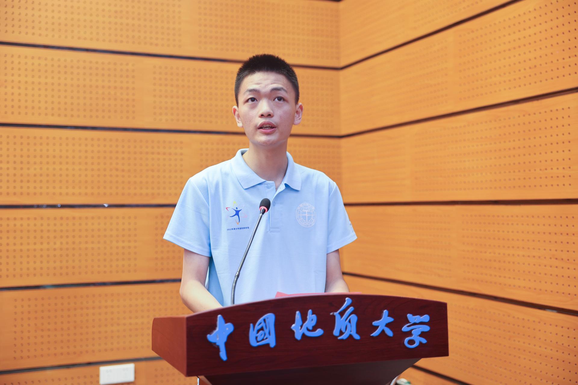 學生志愿者代表張恒發言。他表示,40名志愿者將主動為營員們提供全方位的保障和服務,帶領營員們感受地大的科學文化魅力。