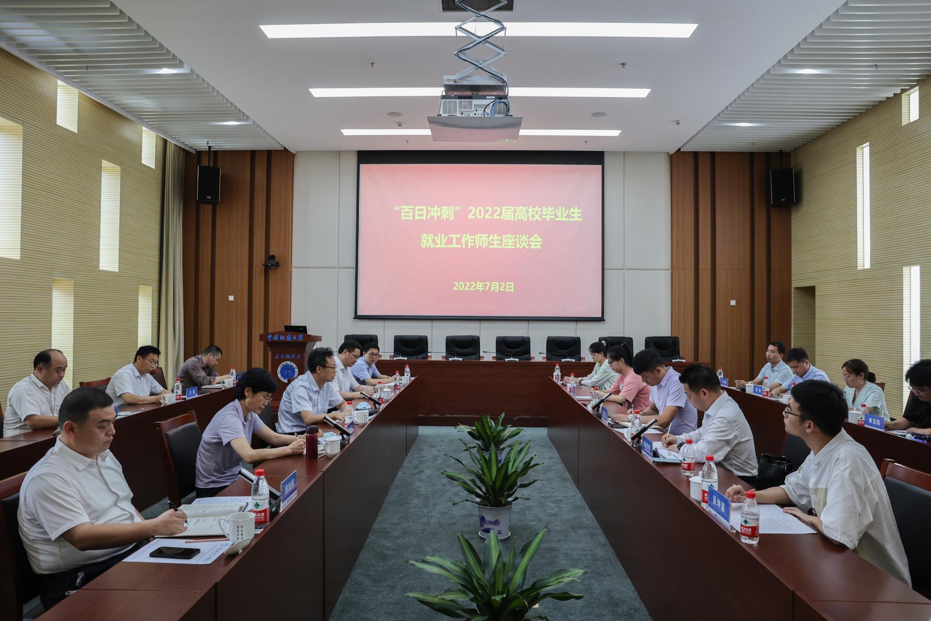 在未來城校區教學服務中心會議室,吳愛華一行與師生代表進行“百日沖刺”2022屆高校畢業生就業工作座談,段旭輝主持。