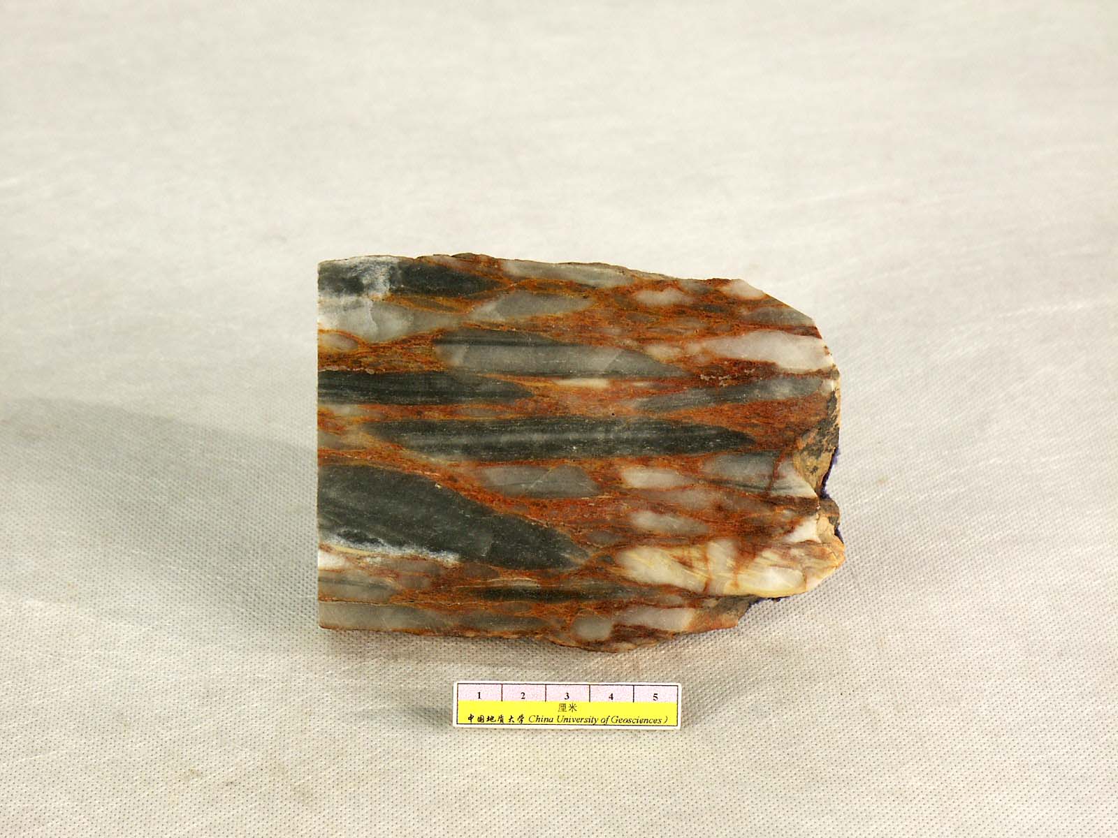 通過觀察中國地質大學逸夫博物館收藏的這塊變成礫巖標本,可以發現,這種變成礫巖顏色呈灰褐色相間,其中角礫呈灰色、基質呈褐紅色。為角礫狀結構,塊狀構造,角礫和基質的主要成分都是石英質的。