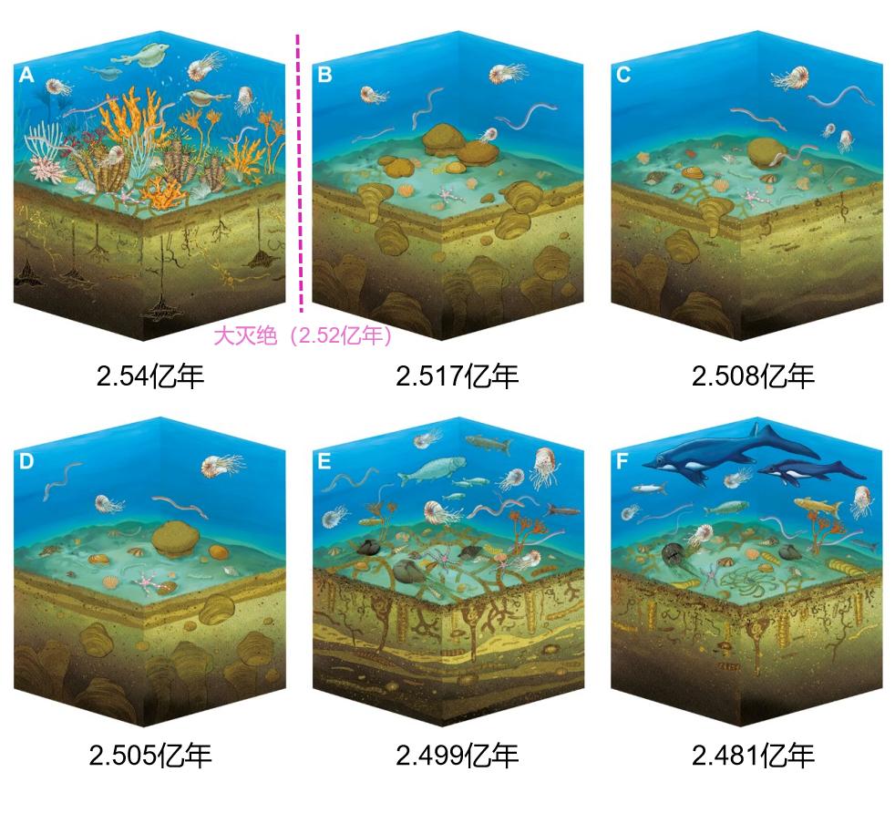 發(fā)生在2.52億年前的生物大滅絕,是地球有史以來遭受最大的一次生態(tài)危機。在這次大災難中,90%以上發(fā)育骨骼的海洋物種在6萬年內永遠滅絕。然而,海洋生物還包括那些通常不被保存下來的軟軀體動物,它們的活動行為在地史時期以遺跡化石的形式保存下來。因此,遺跡化石記錄是全面評價整個海洋生態(tài)系統(tǒng)在生態(tài)大危機中的抗災恢復能力的重要補充。