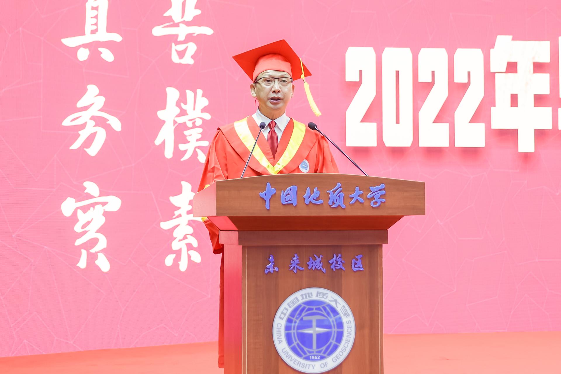 地大新聞網訊(記者龐偉紅 攝影王俊芳 張玉賢 易修平 趙奕康)6月23日,我校2022年畢業典禮暨學位授予儀式以線上線下相結合的方式,在南望山、未來城兩校區同步舉行。校黨委書記黃曉玫,中國科學院院士、校長王焰新,中國科學院院士謝樹成,校領導成金華、唐輝明、賴旭龍、王華、劉杰、劉勇勝,黨委常委、宣傳部部長儲祖旺,校長助理蔣少涌,各教學與科研機構、管理與服務機構負責人,教師代表,2022屆畢業生參加了畢業典禮。