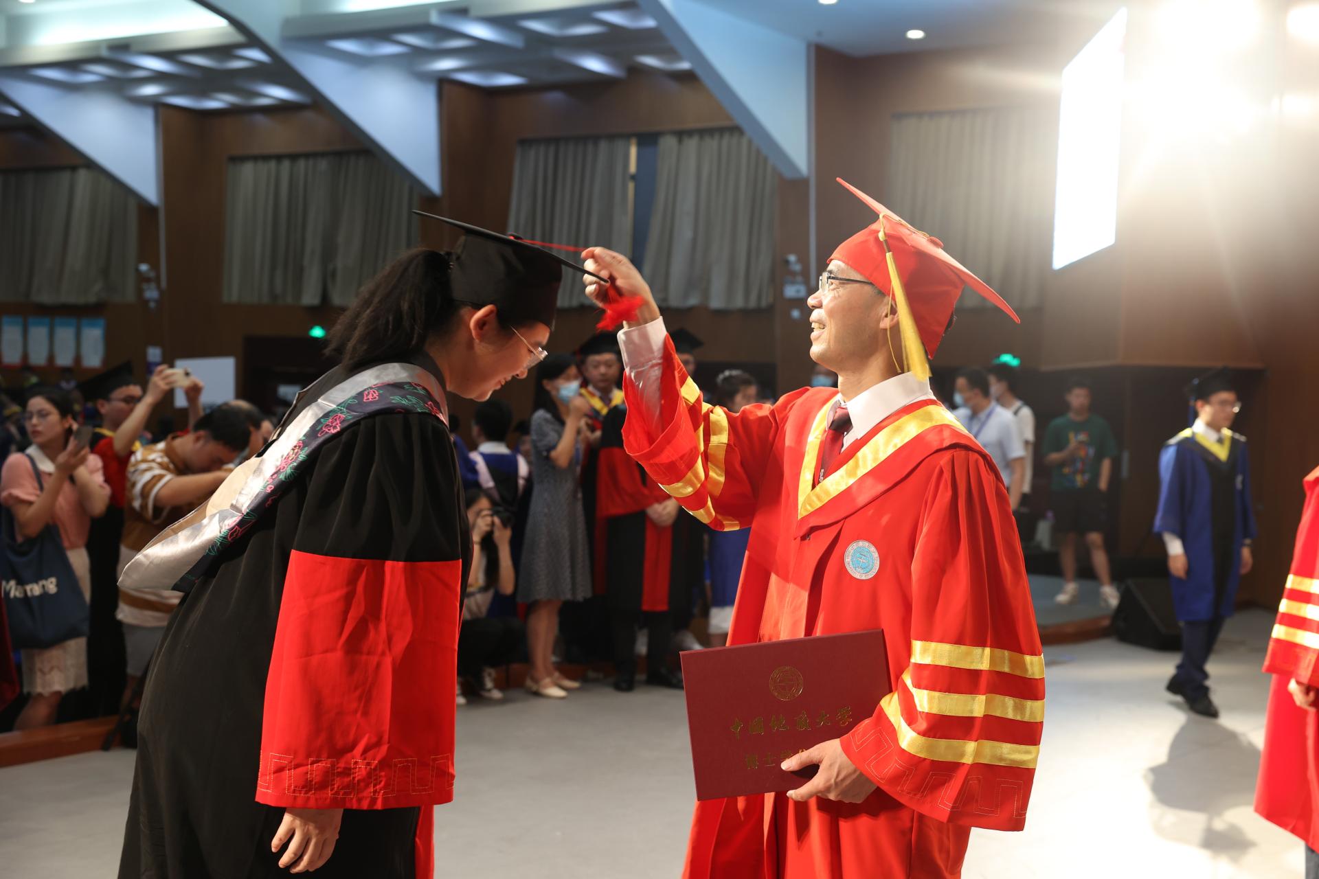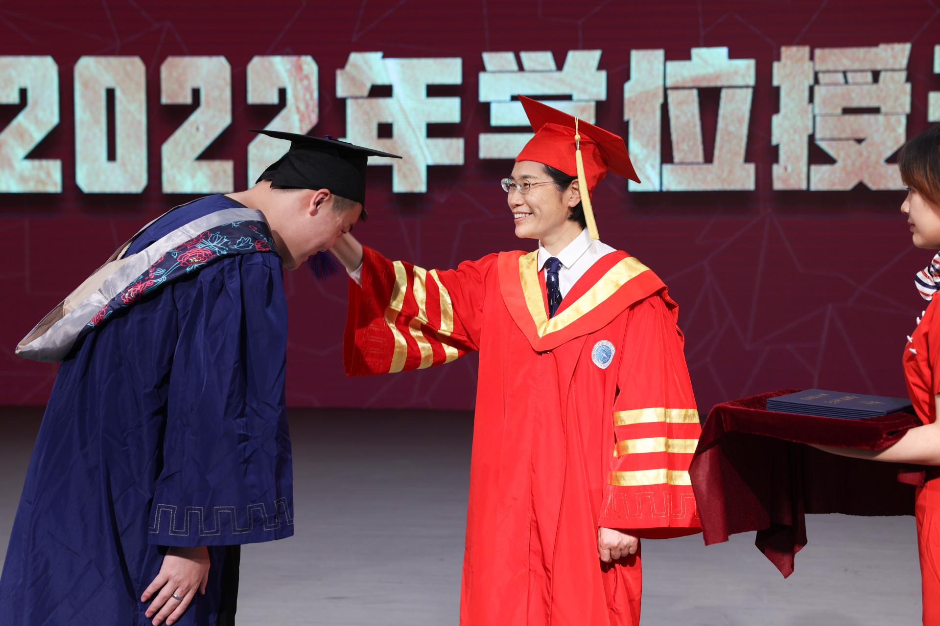 在畢業生學位授予儀式上,院士、校領導為2022屆畢業生代表一一撥穗,并頒發畢業證書。