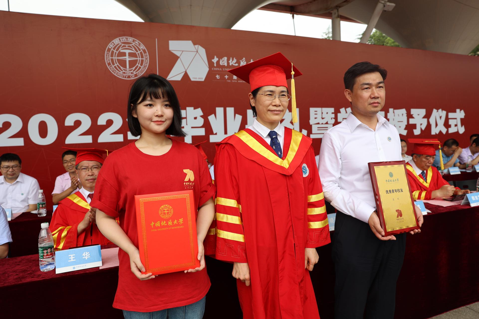 校黨委副書記成金華宣讀《2022屆先進畢業班、優秀畢業生表彰決定》。地球科學學院x11184班、資源學院021181班、025181班等19個學院的31個畢業班集體獲“先進畢業班”稱號。蔡雨田等20個學院的481名本科生,曹國雄等22個培養單位的343名研究生,以及國際教育學院大明、安娜等8名留學生獲“優秀畢業生”稱號。