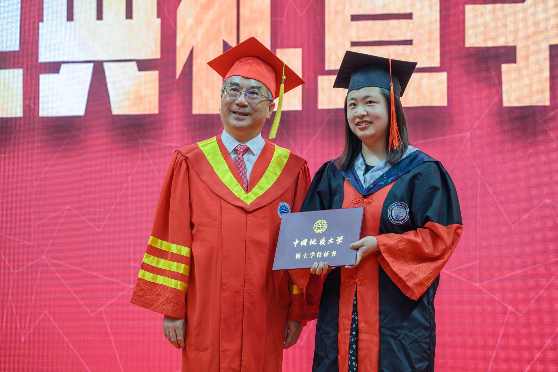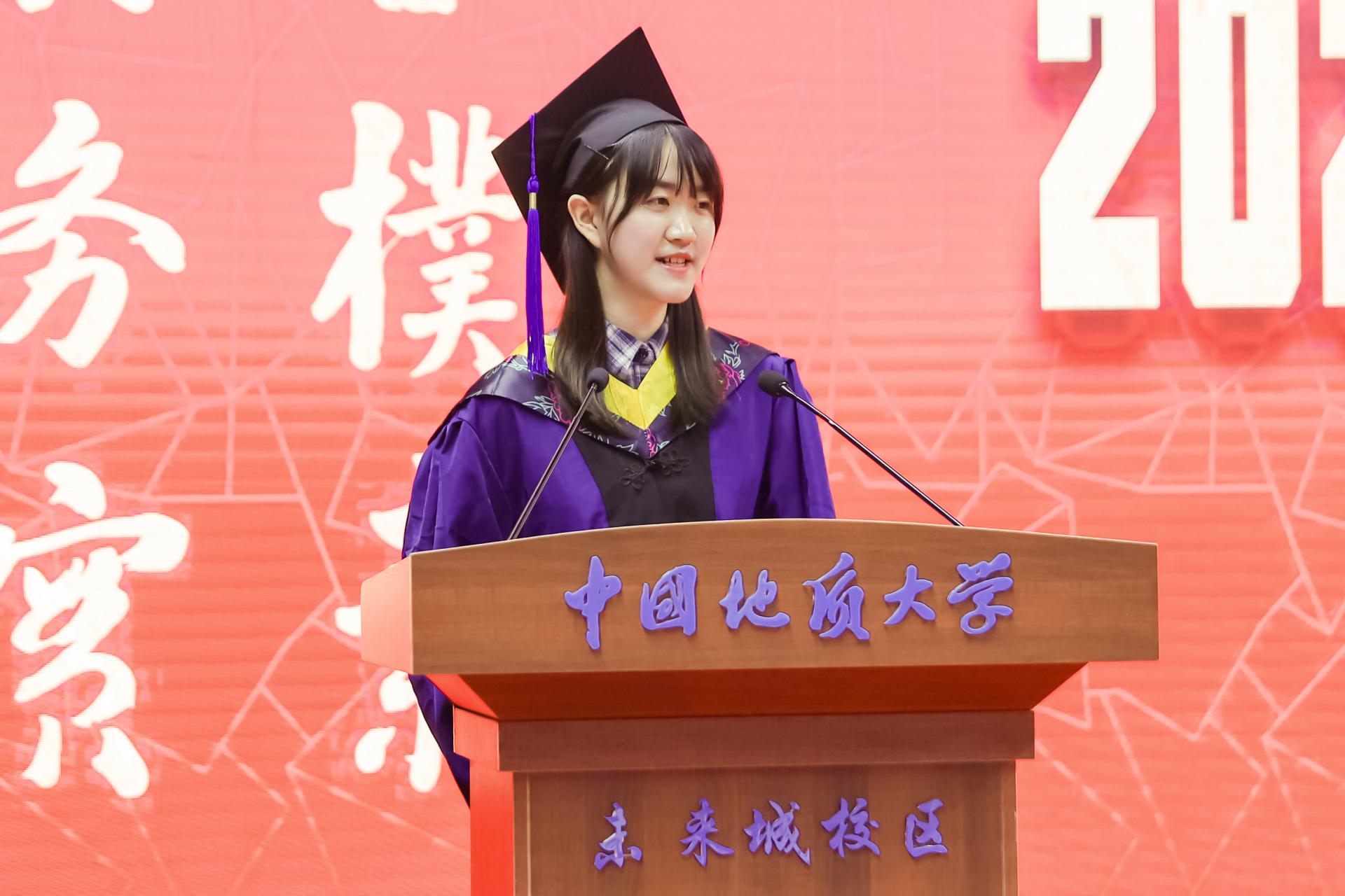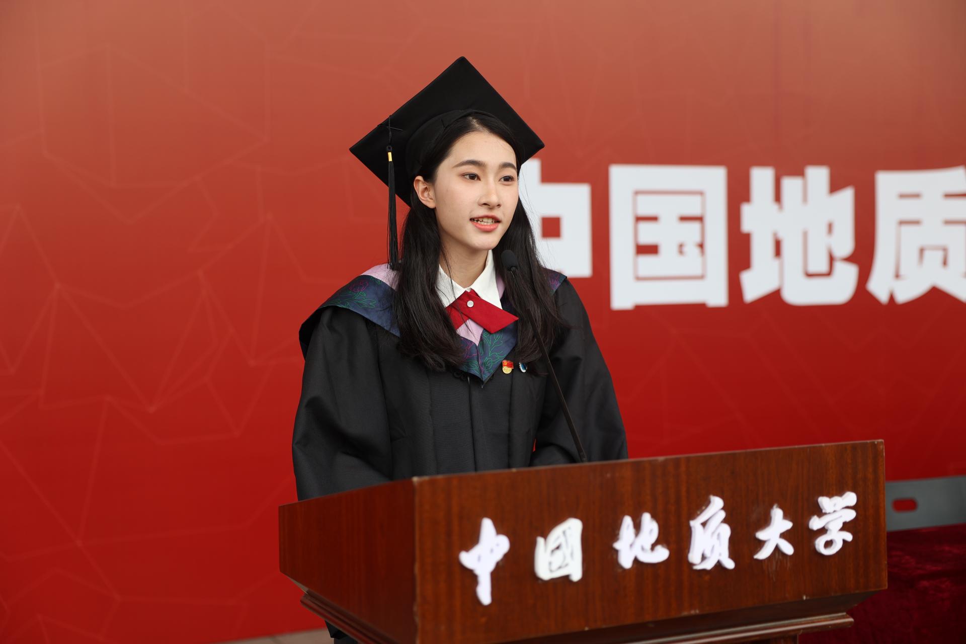 畢業研究生代表、海洋學院地質工程專業碩士研究生謝薇同學發言。她說,七年美妙的地大時光,讓她留戀,地大每一個奮發的青年,讓她感佩。他們將牢記“艱苦樸素、求真務實”的校訓精神,涵養“無峰不可攀”的銳氣和大無畏精神,秉持“會當凌絕頂”的宏大目標,讓地大永不褪色的精神烙印,開啟人生新的篇章。