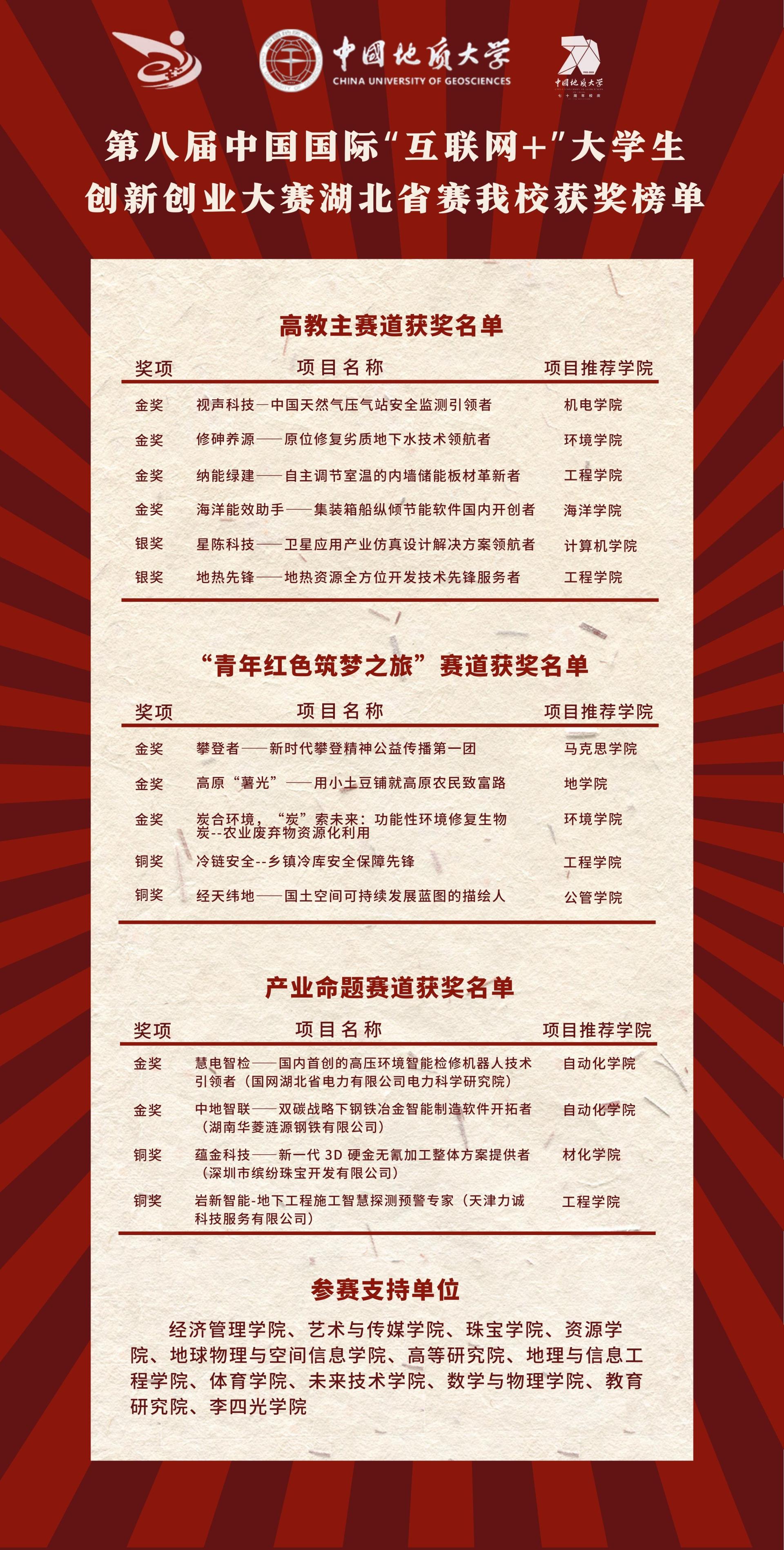 地大新聞網訊(通訊員 陳昭穎 攝影 王藝霖 李疆 許珂)7月29至30日,“建行杯”第八屆中國國際“互聯網+”大學生創新創業大賽湖北省復賽決賽,采用參賽選手線上參賽、評委現場評審的方式在湖北工業大學舉行。我校參賽團隊經過小組賽和金獎排位賽兩輪比拼,共斬獲獎項15項:其中金獎9項、銀獎2項、銅獎4項,金獎獲獎數位列湖北省高校第三,再創我校在本項賽事中的歷史新高。