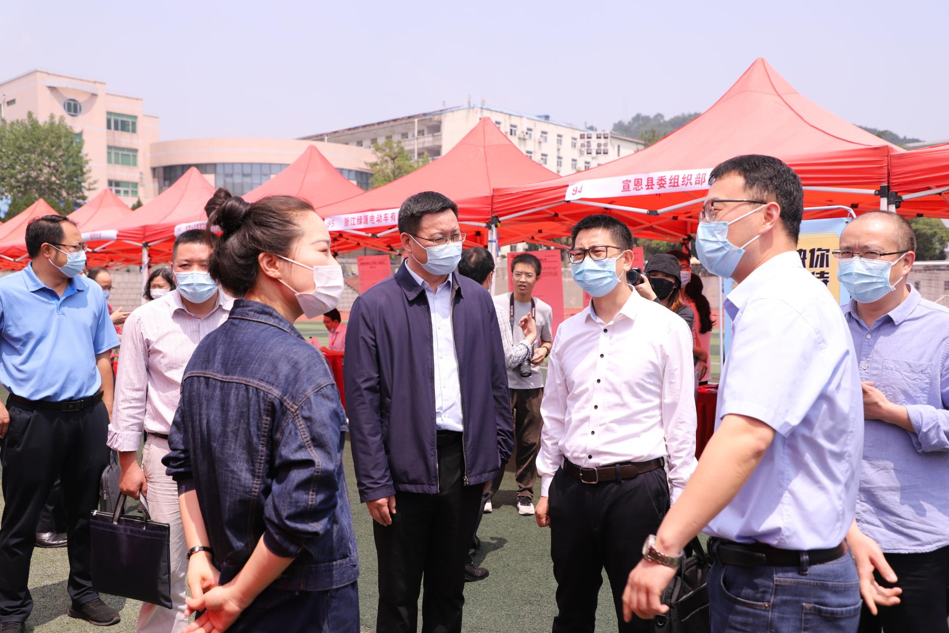 會議結束后,尹云波一行赴招聘會現場指導工作。他對招聘會的組織和開展給予了高度評價,對畢業生積極求職的狀態、現場熱烈的氛圍表示認可,同時深入了解用人單位招聘需求,與恩施宣恩縣委人才辦、浙江省第十一地質大隊的招聘負責人進行交流,聽取用人單位對高校人才培養、就業實習等方面的建議,并希望各用人單位不斷加大來校人才招聘力度,進一步深化校企合作。